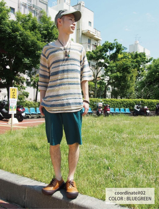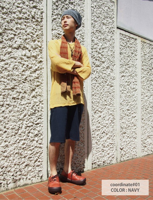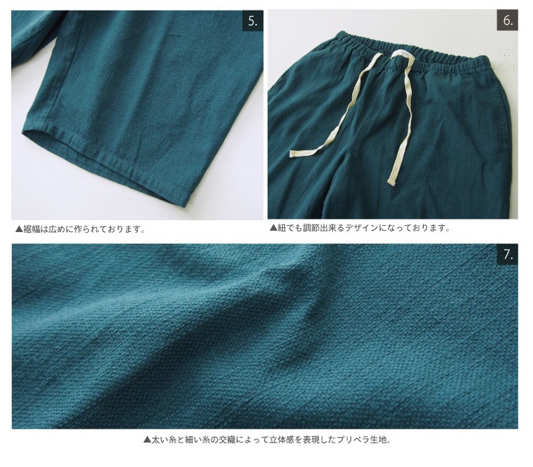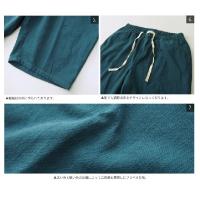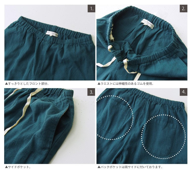 カラーは、ブルーグリーン、ナチュラル、ネイビーの3色。サイズは、ユニセックスサイズ、メンズフリーサイズの2サイズ展開として、男女問わず選んでいただけるパンツになっております。