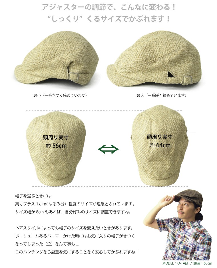GJwebよりオリジナルビッグサイズハンチングの紹介です。通常57-59サイズが基本のメンズハンチングを、サイドにアジャスターを付けることにより57〜62cmの大きめサイズに対応したデザインにしています。頭のサイズが合わずに帽子をあきらめていた方にはもちろん、ヘアスタイルの変化にも対応できるユニバーサルなサイズ感なので、どんな方にもお勧めです!ナチュラルテイストのシンプルな素材使いとデザインで、オールシーズン対応します!様々なコーデに合わせやすくヘビロテ間違いなしのアイテムです!