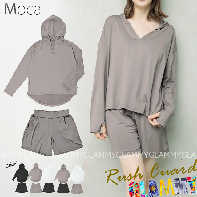 M L LL ラッシュガード 短パン 2点セット フード モカ グレー 水陸両用 レディース 接触冷感 長袖 大きいサイズ 水着の上 体型カバー UVカット メール便送料無料