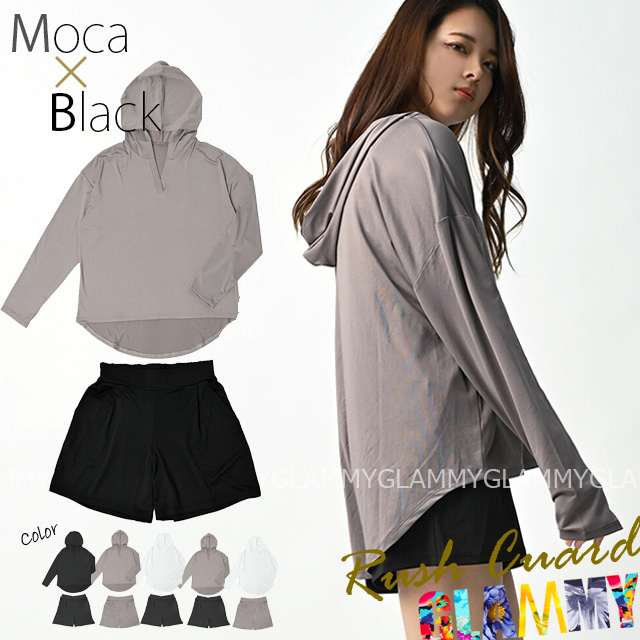 M L LL ラッシュガード 短パン 2点セット フード モカ×ブラック 茶 黒 グレー レディース 接触冷感 長袖 大きいサイズ 水着の上 体型カバー UVカット 送料無料