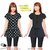 送料無料 フィットネス水着 レディース 体型カバー 水着 大きいサイズ セパレート ドット柄 ブラック ロング丈 2点セット 半袖 袖付き メール便