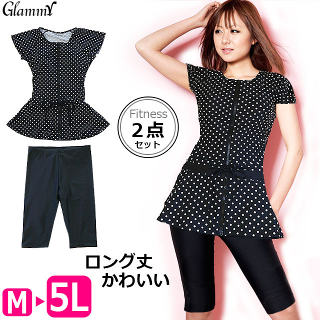 送料無料 フィットネス水着 レディース 体型カバー 水着 大きいサイズ セパレート ドット柄 ブラック ロング丈 2点セット 半袖 袖付き メール便
