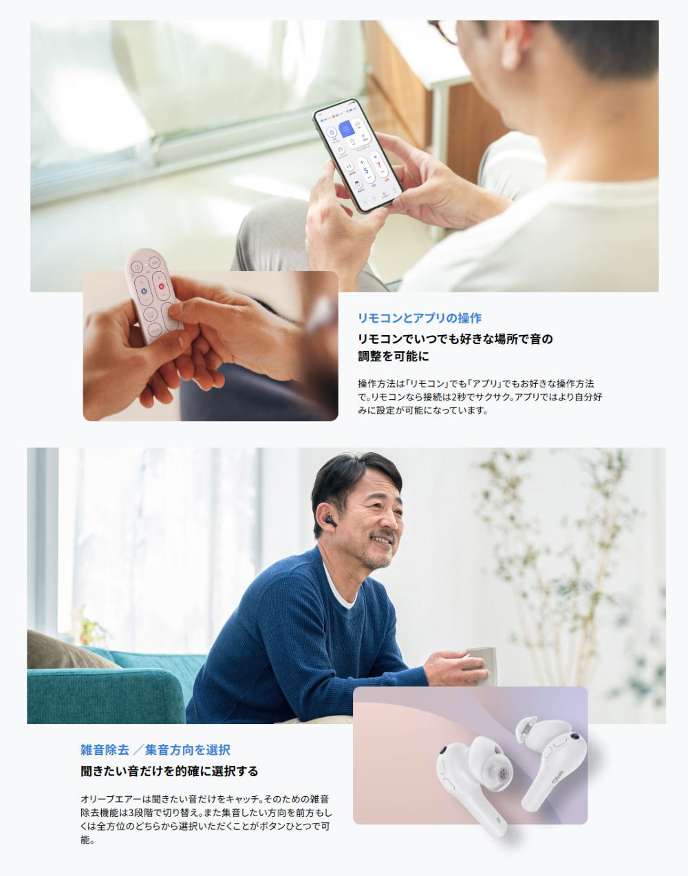 Olive Airはリモコン、アプリ、集音器自体の3つで操作が可能です。