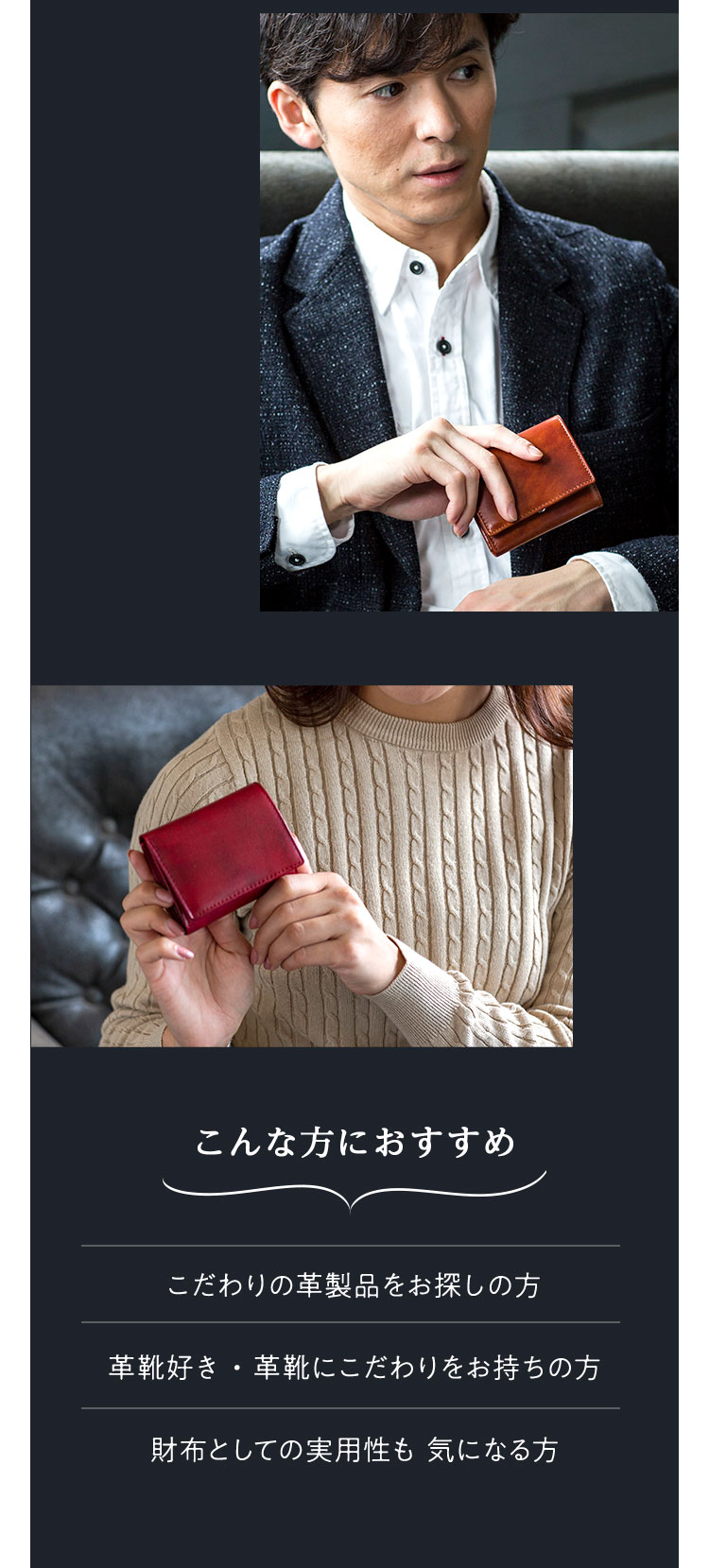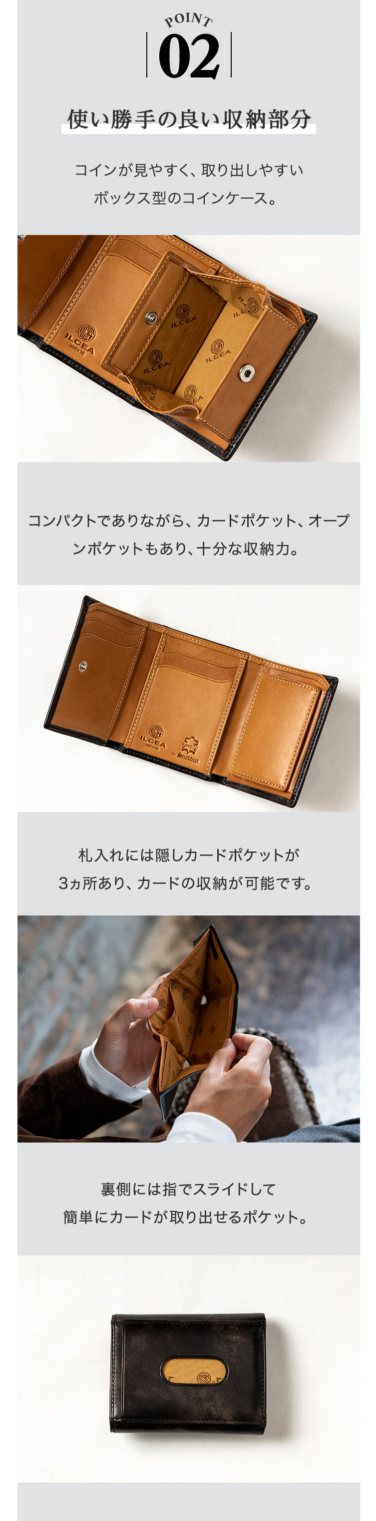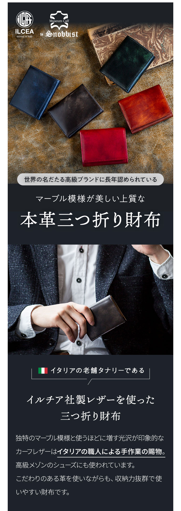 | 商品詳細 | イタリアのタナリー・イルチア社による、高級靴にも使用される「ミュージアムカーフ」の胸ポケットサイズの三つ折り財布です。 カーフ(仔牛)レザー特有のきめ細かい質感と柔らかな触感は、長く愛用するにふさわしい気品を携えています。 BOX型の小銭入れを採用し、裏面にはIC定期券を入れられるポケットを搭載。指でスライドして簡単に取り出せるので提示時などにも便利に活用できます。 |