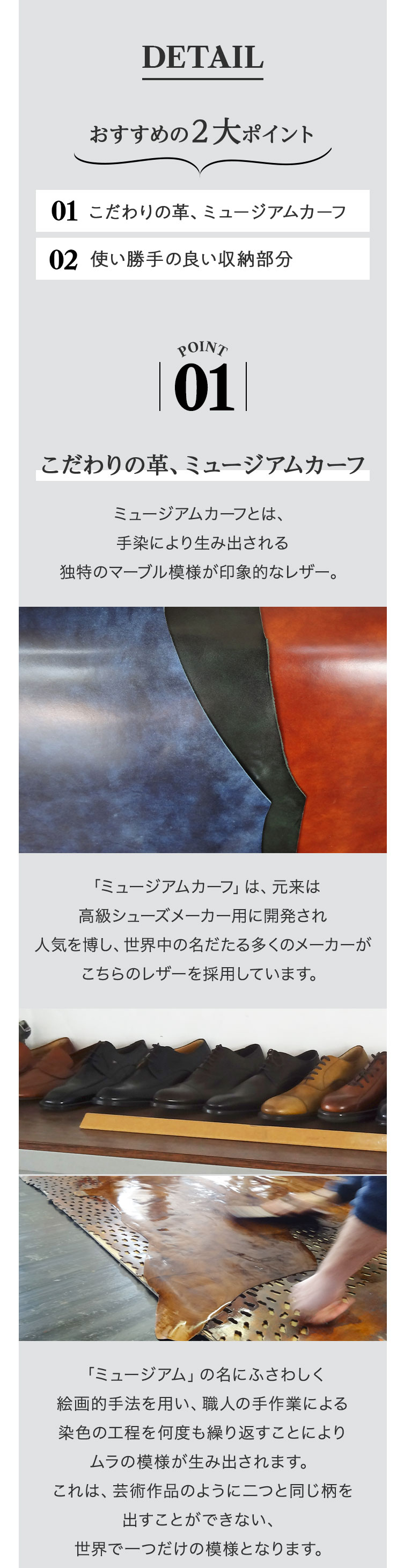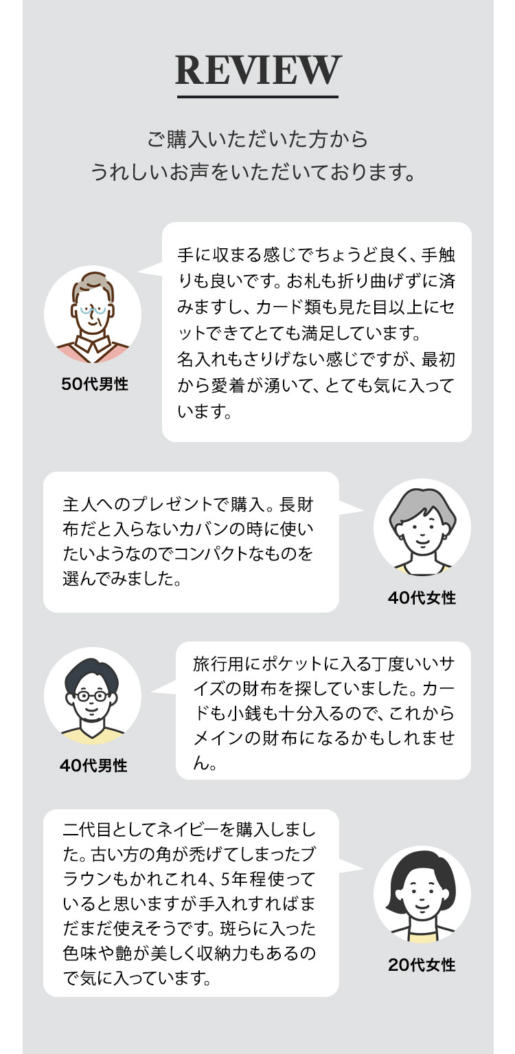 | 素材 | [外側]牛革(イタリアンカーフ)[内側]牛革(イタリアンレザー・ヌメ革)・ポリエステル |