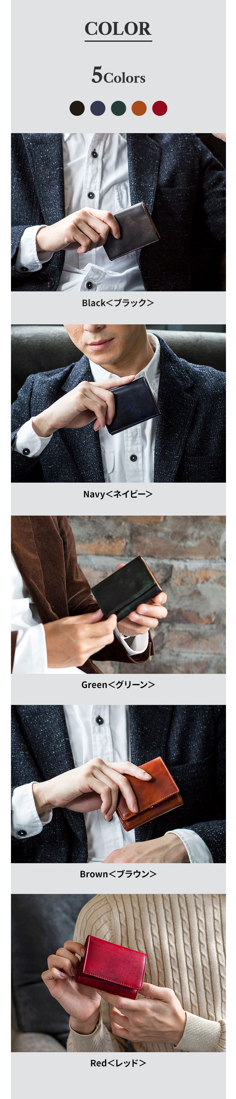 | カラー | ブラック(黒)、ブラウン(茶)、ネイビー(紺)、グリーン(緑)、レッド(赤) |