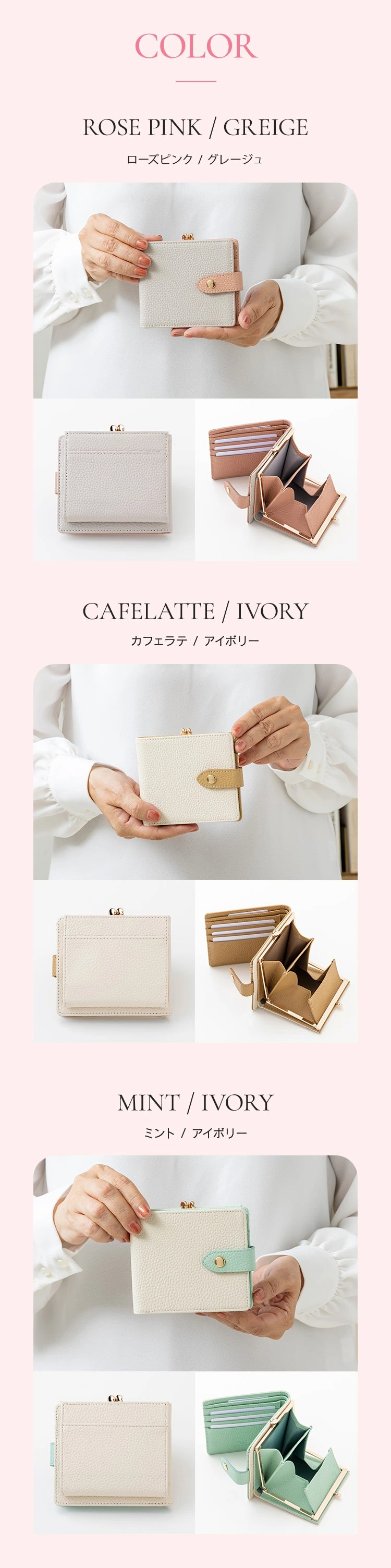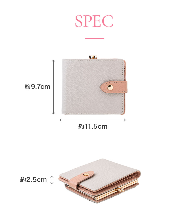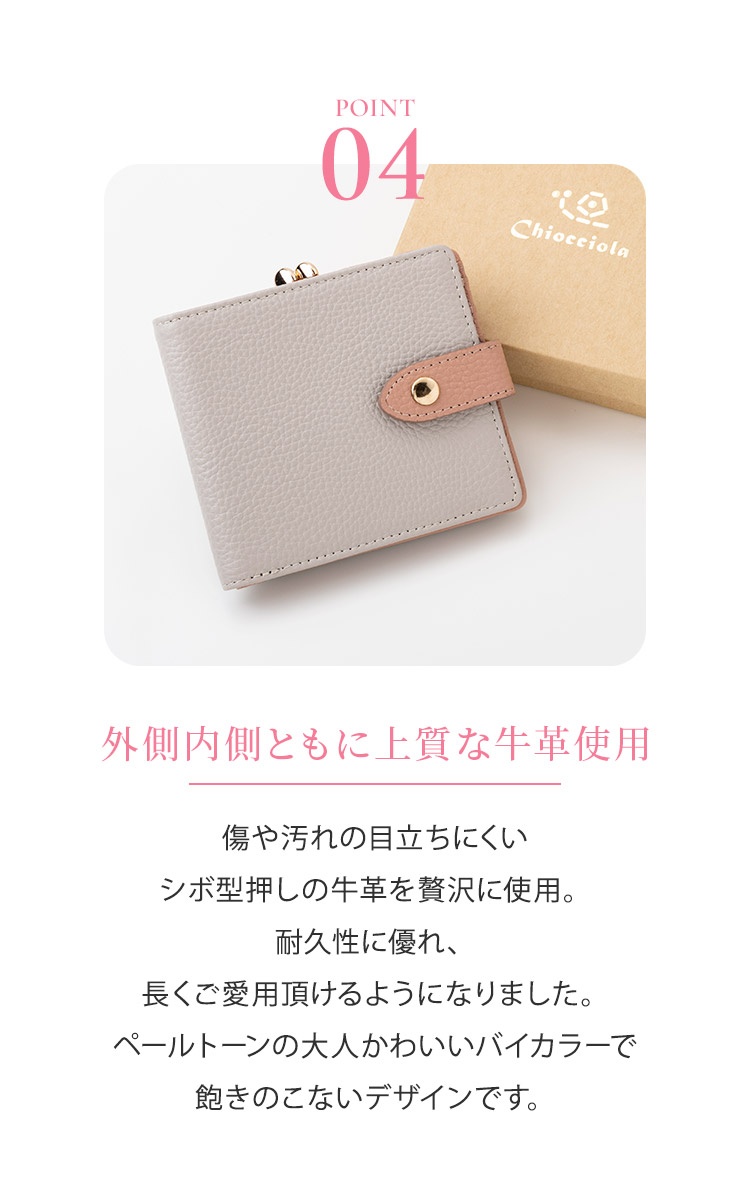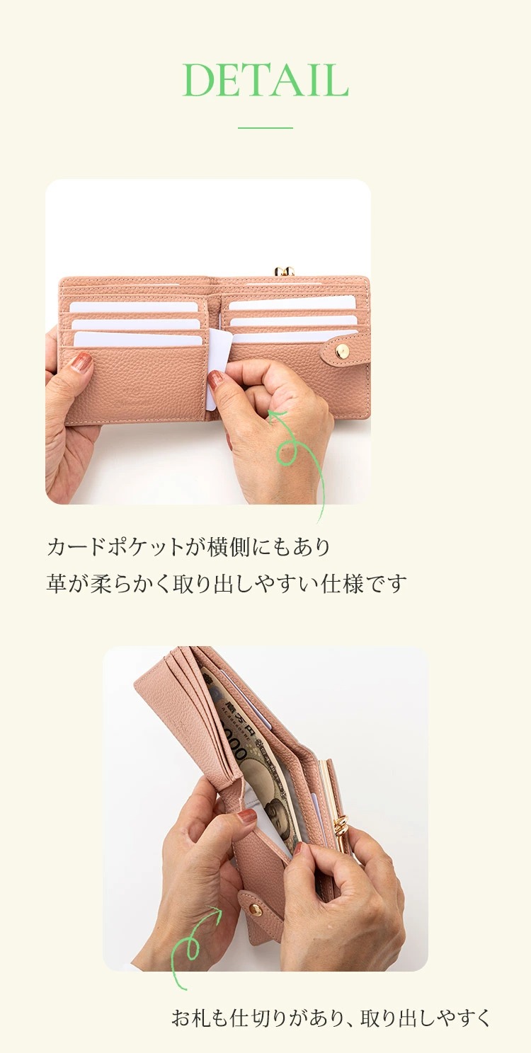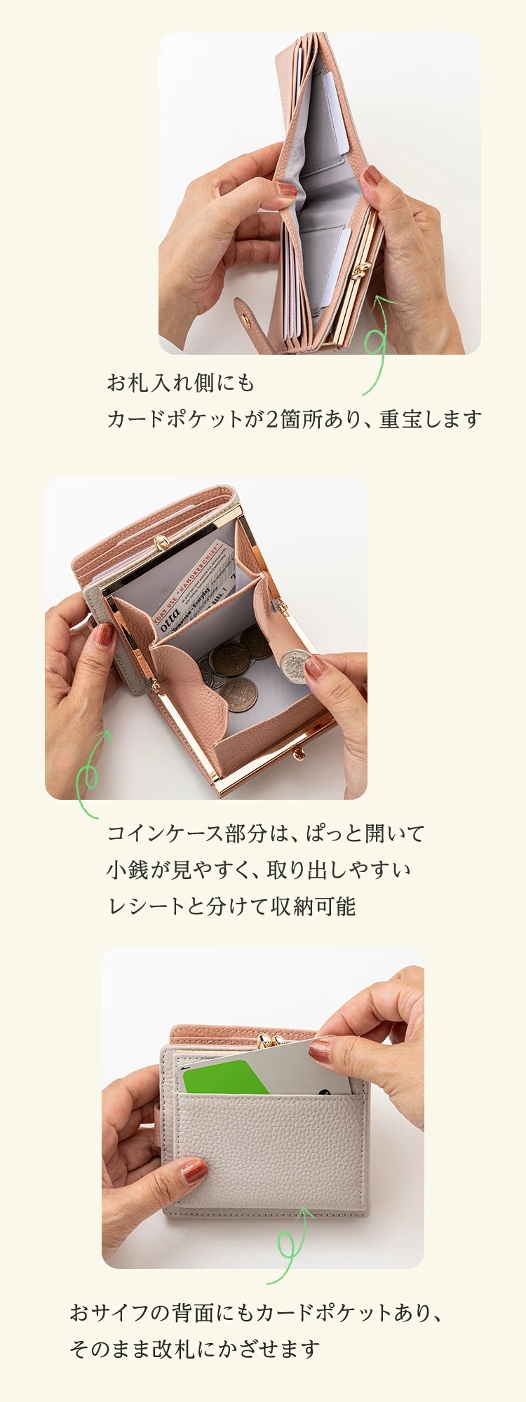 お札、カード、小銭入れが同じ向きで、探しやすく取り出しやすさに優れた本革がま口財布。
