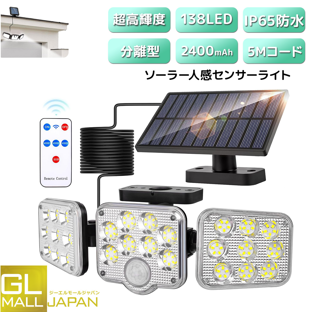 分離式 リモコン付 3面広角 LED ソーラーライト138led センサーライト 人感センサー 明暗センサー 太陽光パネル 屋外 防犯 照明 防水日本語説明書 限定セール