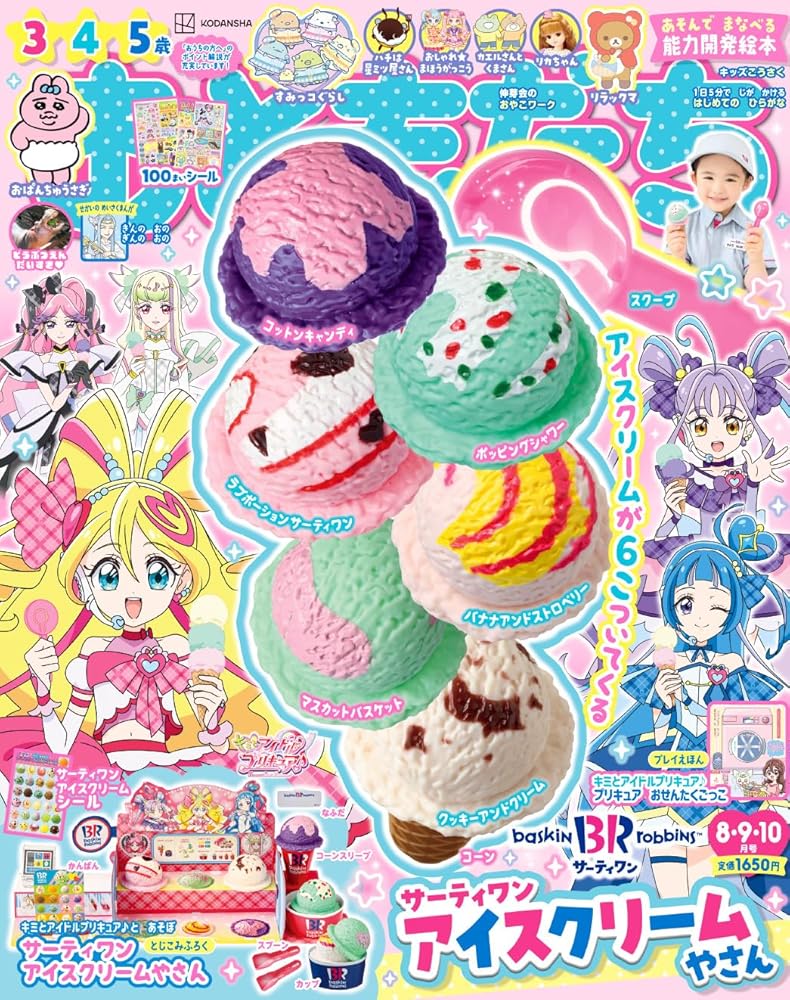 | 商品の説明 | おともだち8・9・10月号の付録は、毎年大人気の「サーティワン アイスクリームやさん」! みんなが大好きなフレーバーがミニサイズのおもちゃで大集合。 実際のお店とおそろいのアイスクリームが、なんと6種類も付いてくるよ! 今年はカラフルでかわいい「バナナアンドストロベリー」と「マスカットバスケット」が初登場? さらに、とじこみ付録の「キミとアイドルプリキュア♪とあそぼ サーティワン アイスクリームやさん」では、お店みたいなショーケースやかんばん、レジ、名札までセットになっているよ。 プリキュアがデザインされていてとってもかわいい? お店みたいにアイスクリームをズラッと並べて遊んじゃおう! スクープですくって「ポン!」と重ねたら、気分はサーティワン アイスクリームの店員さん♪ プリキュアと一緒に、「サーティワン アイスクリームやさん」ごっこを楽しんでね! さらに、「サーティワン アイスクリームシール」も付いてくる! 好きなものに、大好きなアイスクリームのシールを貼っちゃおう♪ 【付録内容】 ・コットンキャンディ ・ポッピングシャワー ・ラブポーションサーティワン ・バナナアンドストロベリー ・マスカットバスケット ・クッキーアンドクリーム ・スクープ ・コーン ・コーンスリーブ ・スプーン ・カップ ・サーティワン アイスクリームやさん ・名札 |