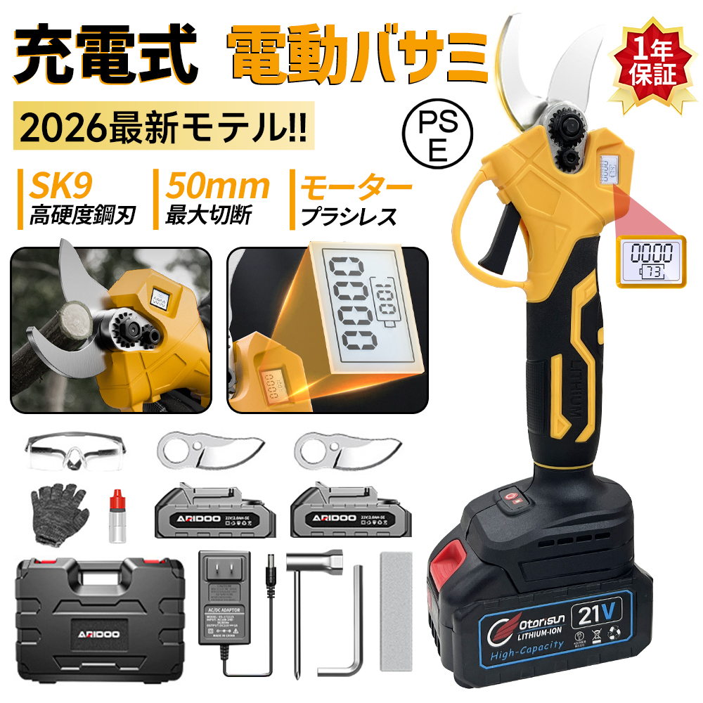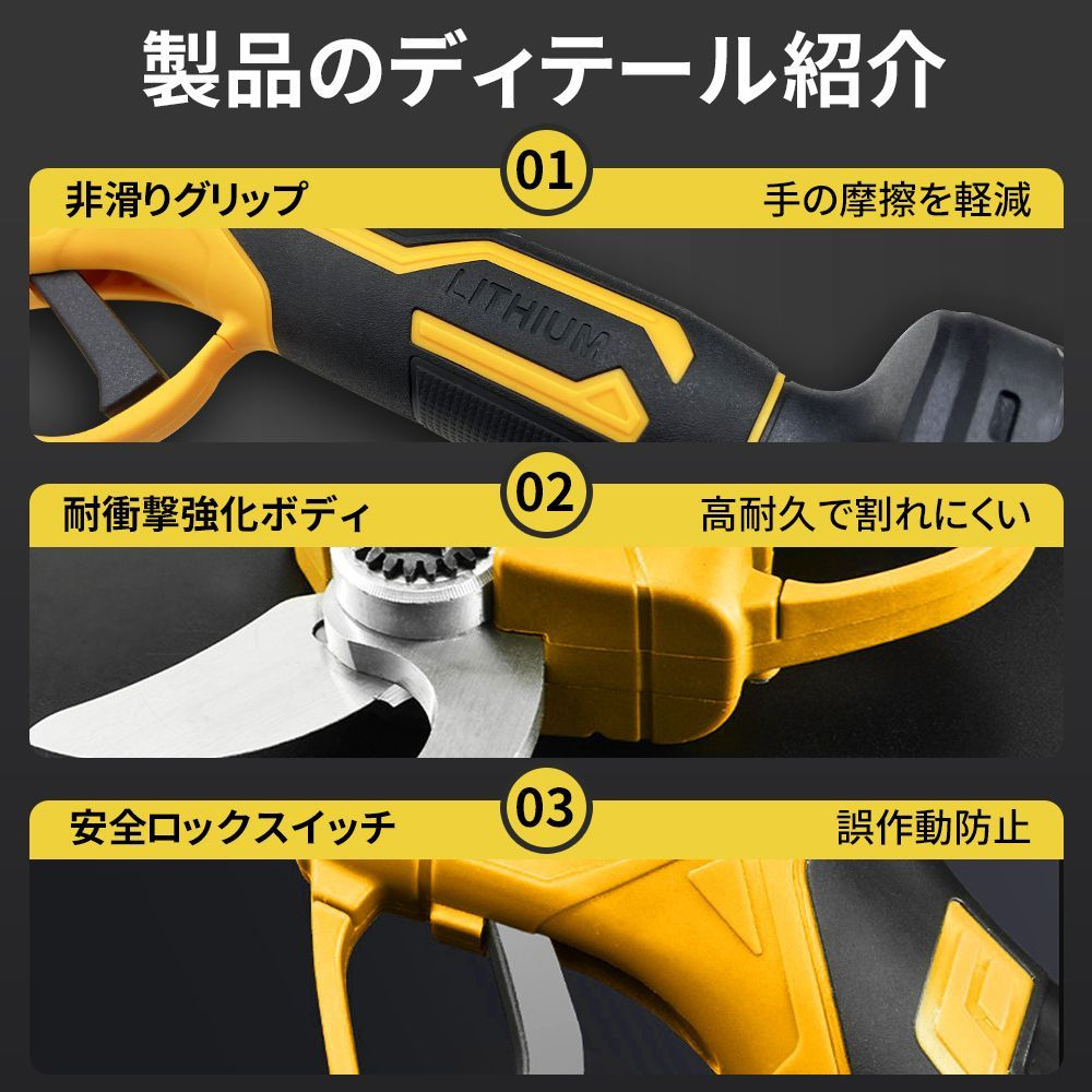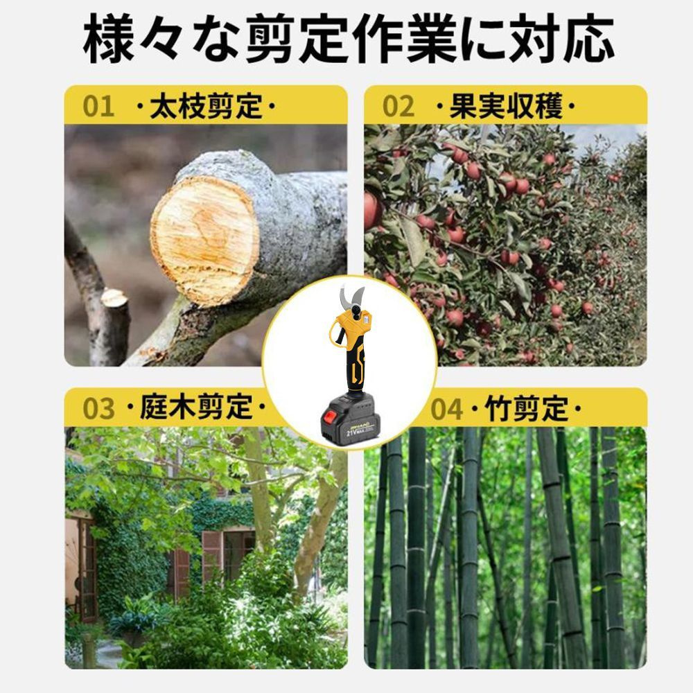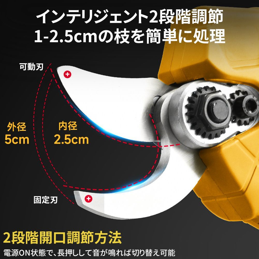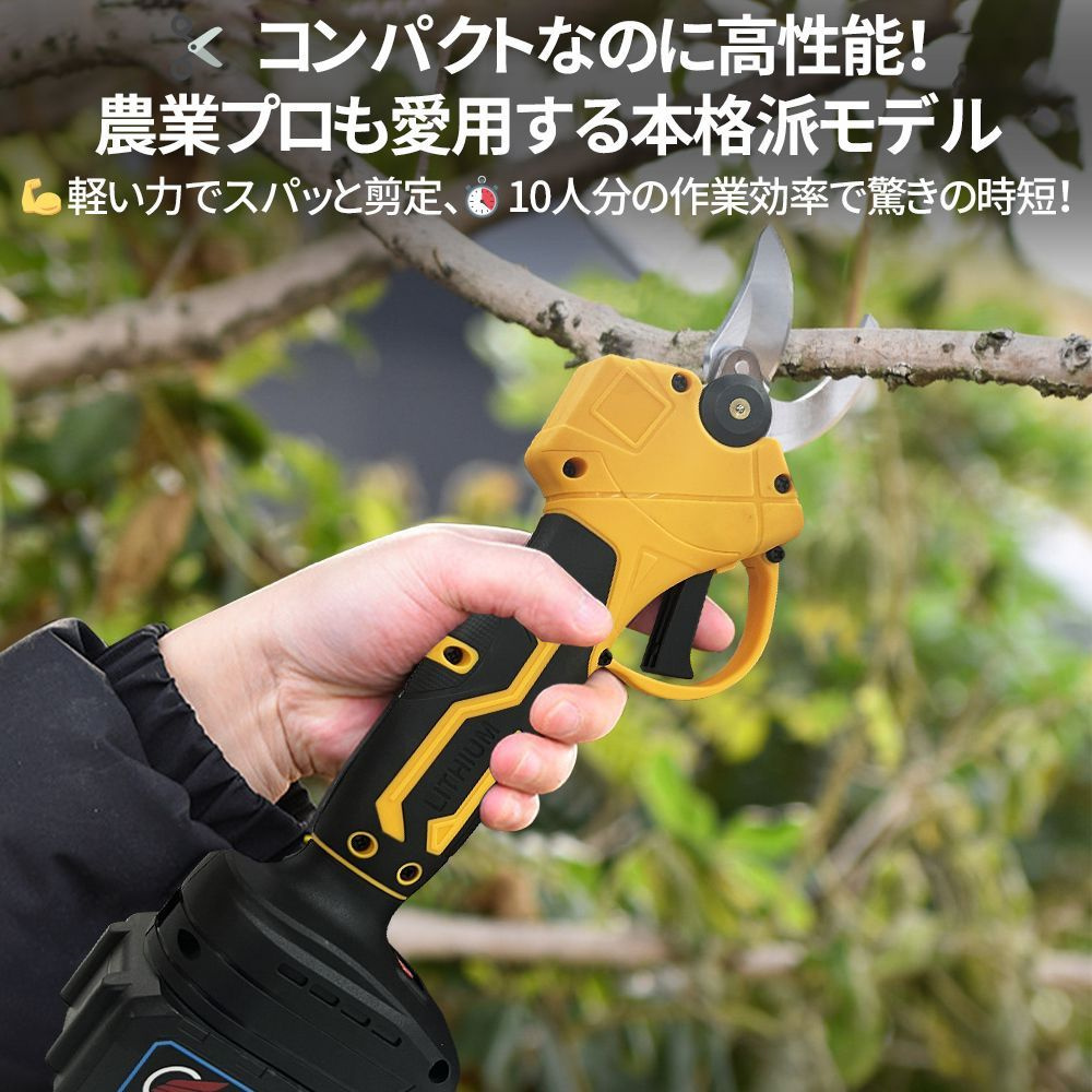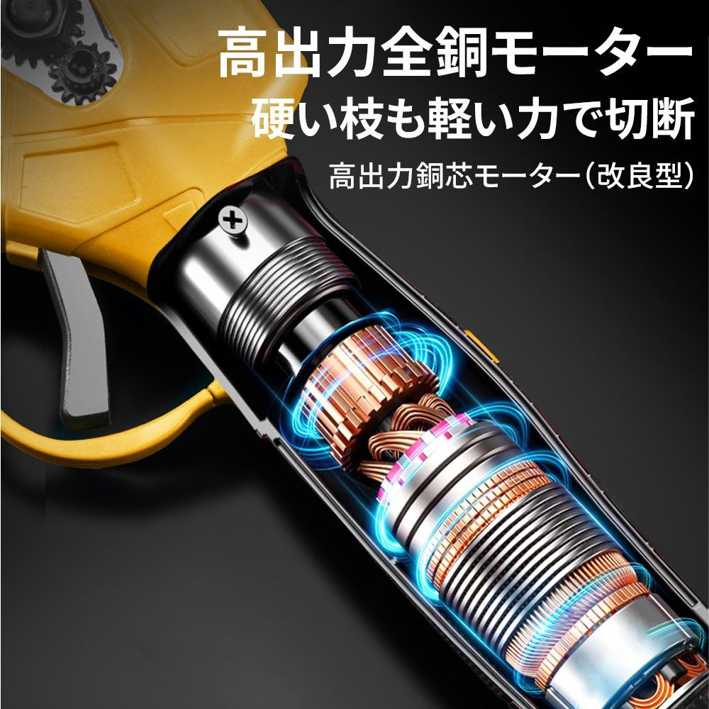 ハイパワーブラシレス永久磁石モーター搭載し、超強動力を提供し、50MMの生木を0.5秒に瞬時切断、一日に600本の果樹を剪定できます。