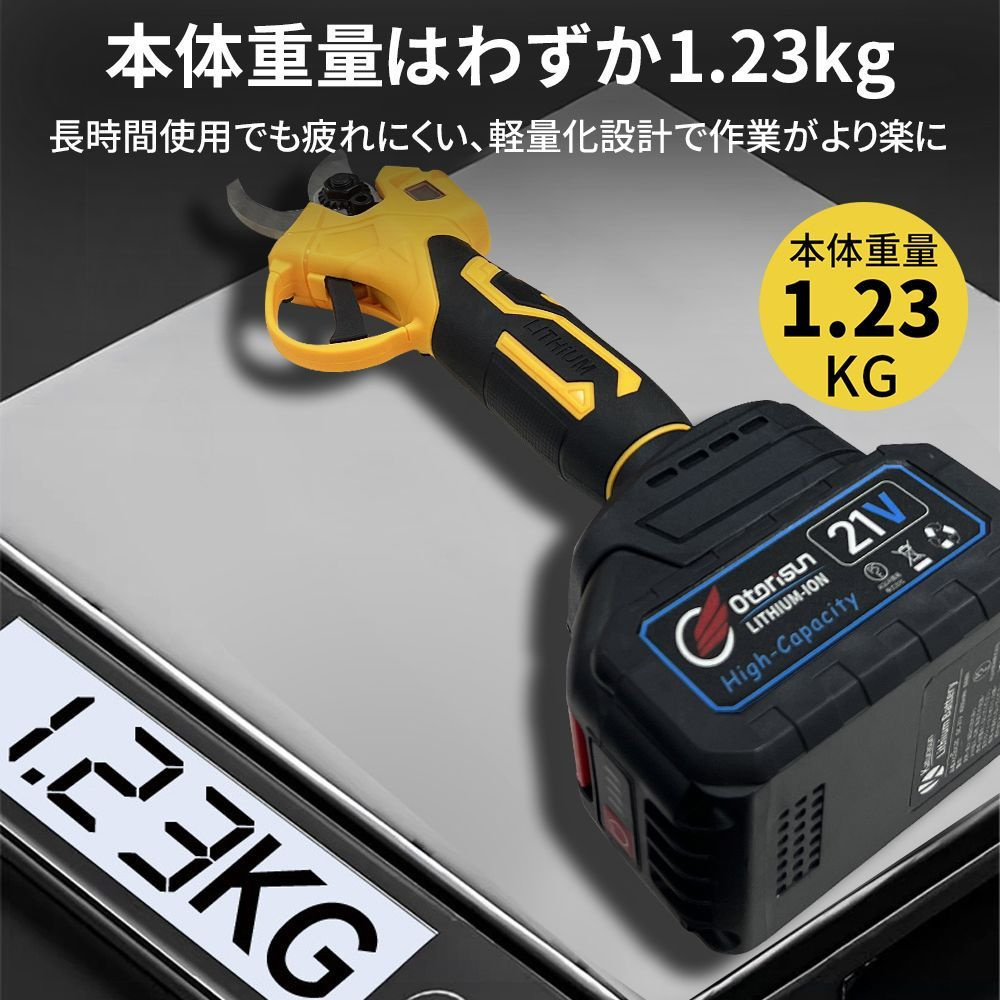 電動剪定バサミの本体重量1.2 KG、軽くて持ちやすい、女性でも簡単に効率よく剪定できます。長時間剪定するのも楽です。