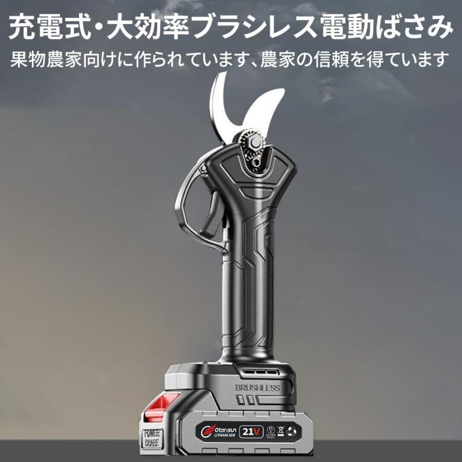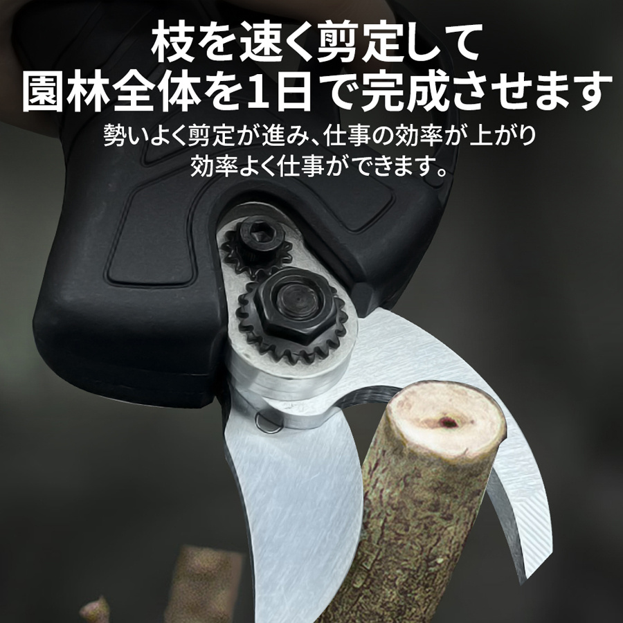 電動剪定ハサミはブラシレスモーター付きの新型電動ハサミ です。安定した性能、高速回転、優れ耐久性と長寿命の特性がります。直径10 20 30 50mmまでの切断が可能です。スーパーパワーで、太さ50mmの枝も1秒で切断できます。コードレス充電式剪定ハサミ、電源が不要であり、様々な場所で使用することができ、場所の心配がありません。