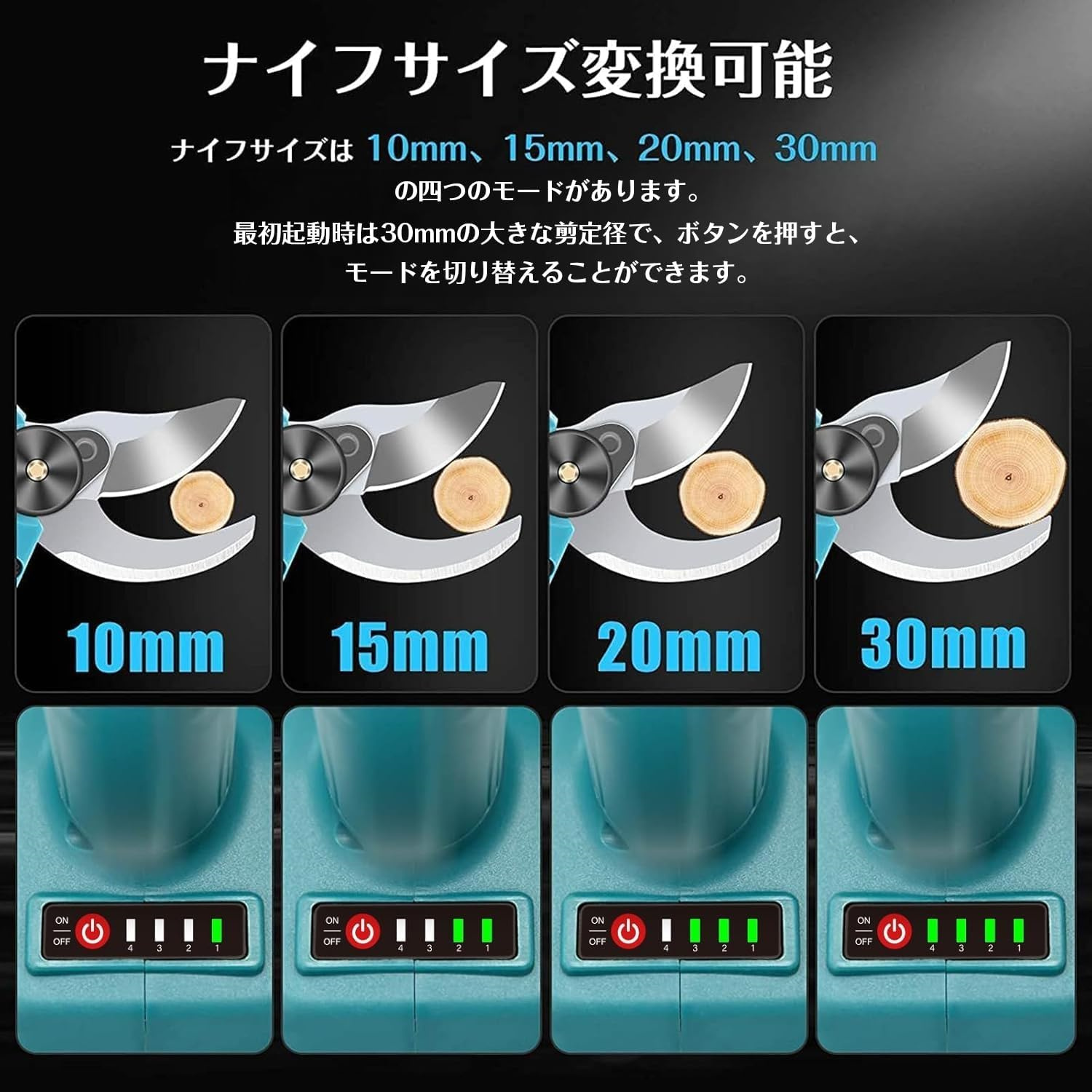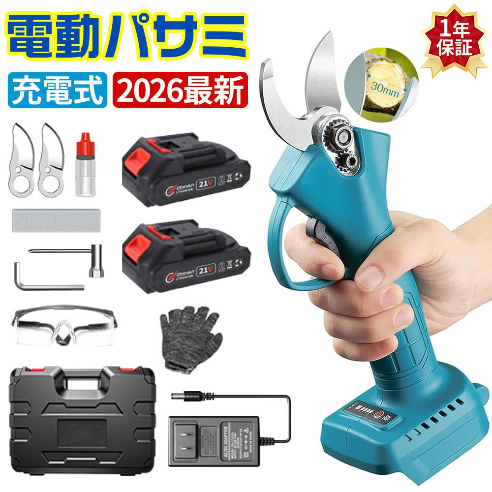 この電動剪定ばさみは最大切断直径30mm(4段階調整)対応。500Wブラシレスモーター搭載で庭木・枝切り・果樹の剪定を効率化。省エネ・静音設計で快適に作業できます。