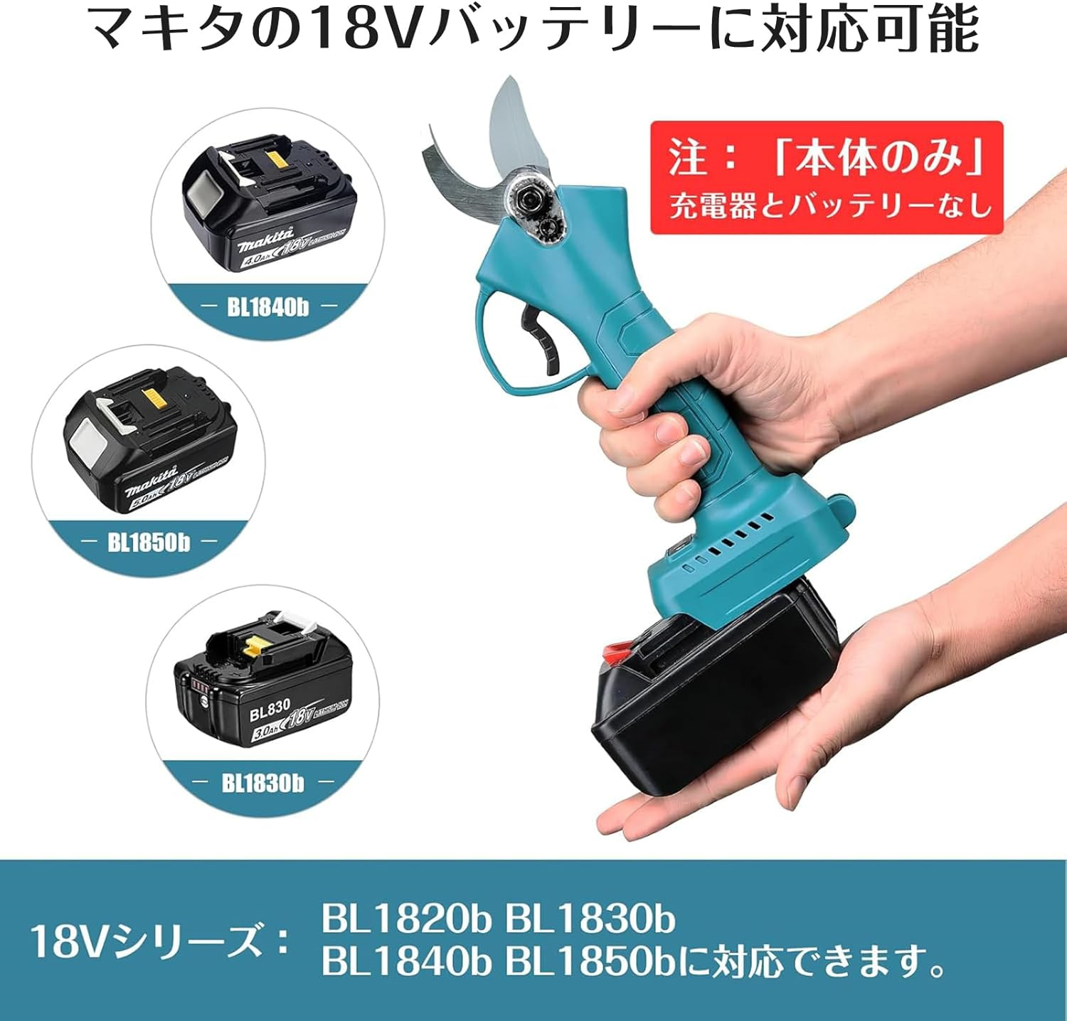 **マキタ18Vバッテリー(BL1815N/BL1830/BL1860B等)**対応。充電式 剪定ばさみ電動としてケーブル不要で自由に作業可能。持続力が高く作業効率も向上。