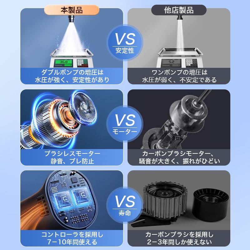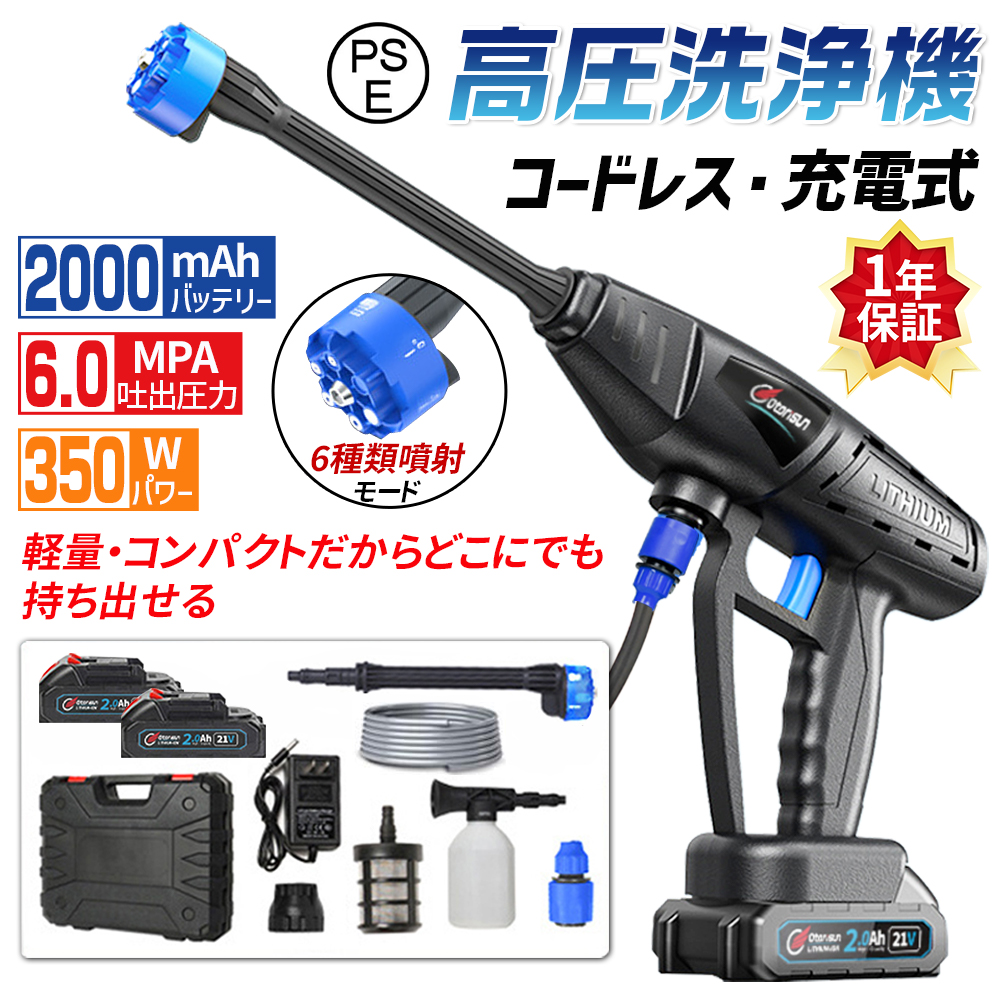 コンセントが必要なく、使い勝手が非常に良いため、屋外での作業や車の洗車などに最適です。また、強力な噴射力を持ち合わせており、汚れやホコリをしっかり落とすことができます。愛車の洗車にはもちろん、庭や窓、階段、外壁など、清掃が必要な場所に幅広く活用できます。6種類の機能ノズルが付属し、作業に合わせて使い分けることができます。