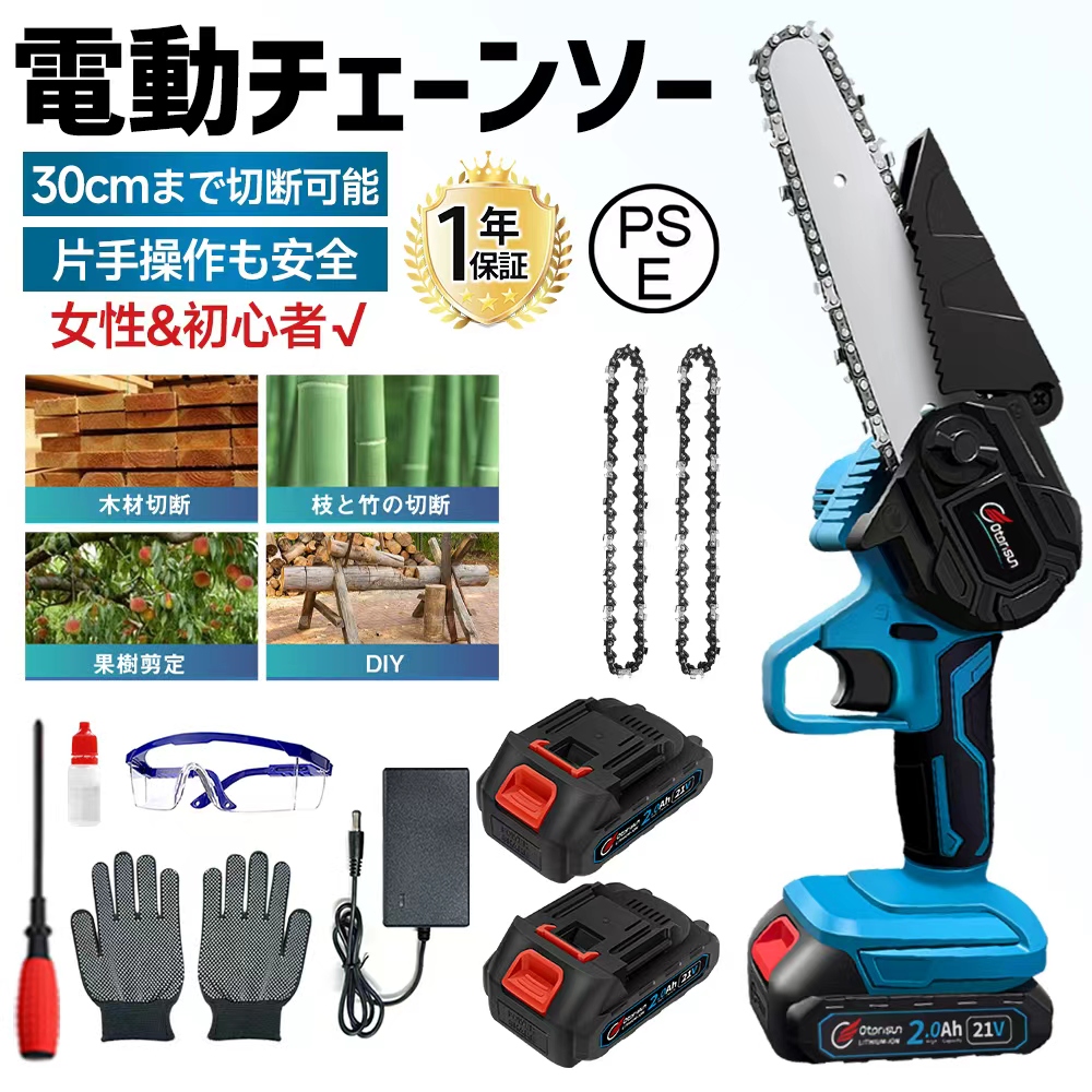 チェーンソー本体*1、バッテリー*1、充電器1*、収納箱*1、チェーン*1、ドライバ*1、ゴーグル*1、手袋*1、オイルボトル*1;