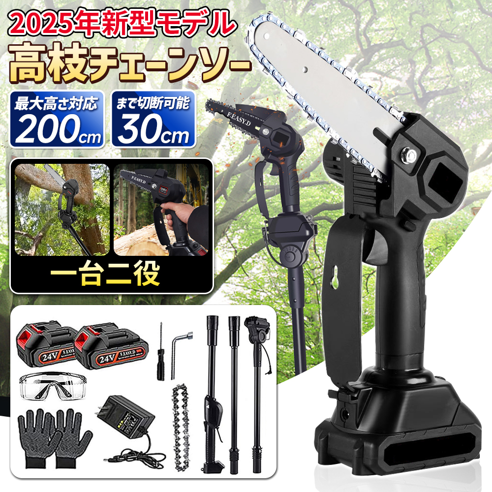 高枝切りチェーンソー 高枝切りバサミ 最長200cm 電動チェーンソー 充電式 高枝切りノコギリ コードレス 着脱式ポール 軽量 木工切断 枝切り 電動のこぎり