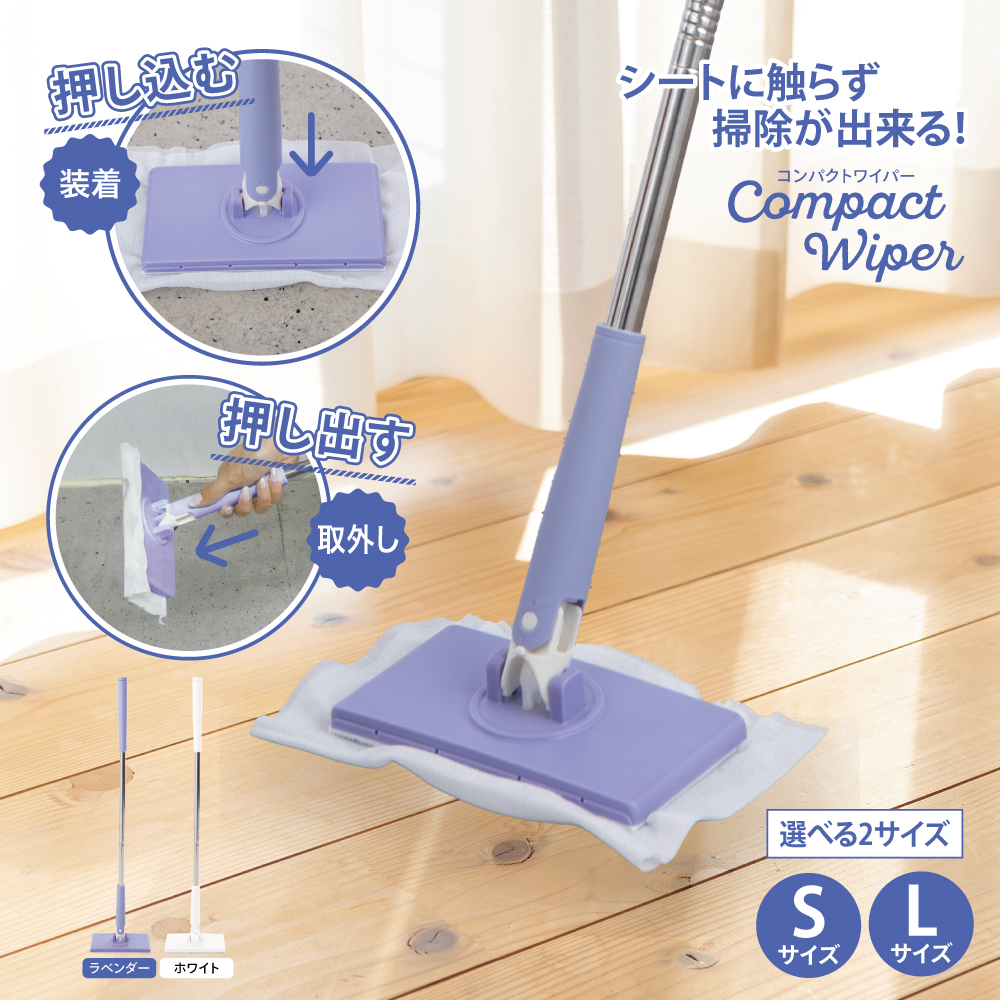 狭いところにも入りやすい小回りがきく「コンパクト設計」ひざをつかずに「ラク」に拭けるかがむと腰や膝が痛いシートを取り付けるのが面倒汚れたシートを触りたくないシートの上から押し込む&押し出すだけ!超簡単!楽々!・シートの取り付け前に本体の先を押し込んでヘッドを開けてください。・シートの取り付けは立ったままで楽々!シートの上から押し込むだけで簡単にセット完了!・手を汚さず清潔に使用できます。掃除が終われば、本体の先をスポッと奥に押し出すとそのままゴミ箱へ3分割できてコンパクトに収納できる!組み立てもくるっと簡単!便利なピンセット付き!持ち手部分の先端を引っ張ると中からピンセットが出てきて掃除用ウェットシートなど掴む際に使用できます。ヘッド部分は90度角度を変えられるので細い場所にも使える。収納時もコンパクトにできます。【商品名】コンパクトワイパー【サイズ】S・L【カラー】ラベンダー・ホワイト【材質】ポリエチレン・ABS・スチール【商品サイズ】Sサイズ:本体サイズ約W16×D8×H70cmLサイズ:本体サイズ約W16×D8×H94cm【付属品】本体(3分割可能)専用ピンセット(※持ち手パーツの先端に収納)グローバル・ジャパン