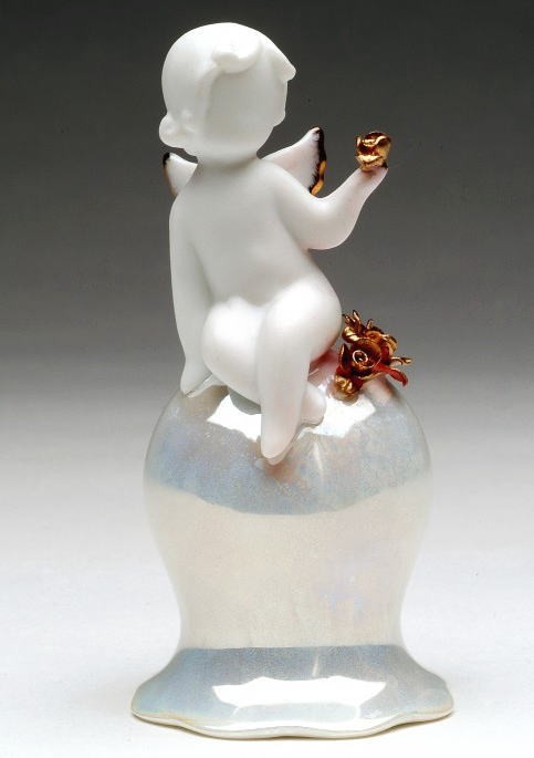 可愛らしい天使がベルの上に座り、ゴールドのローズを手にしています♪