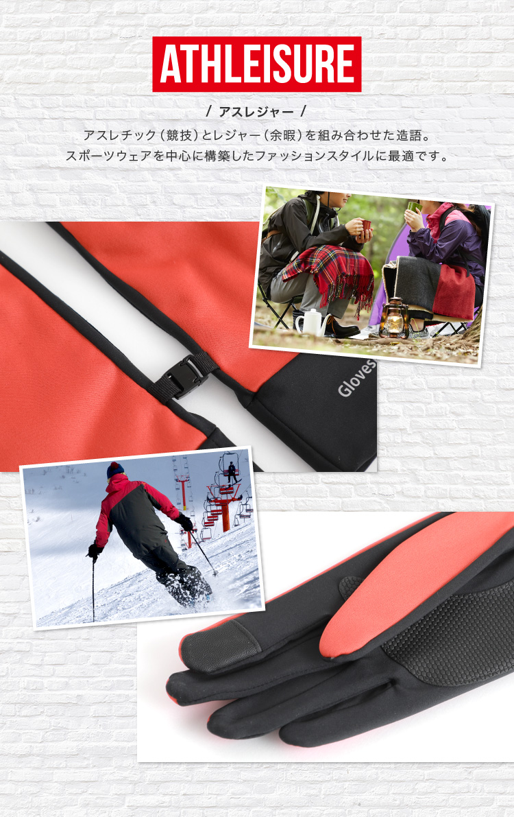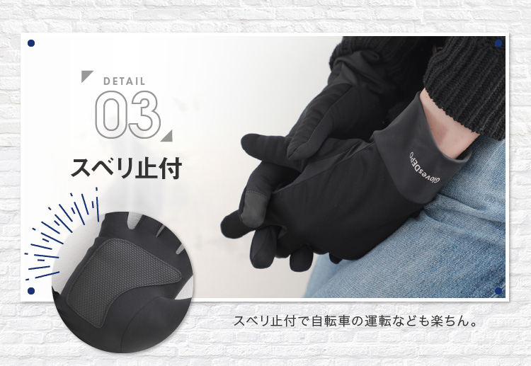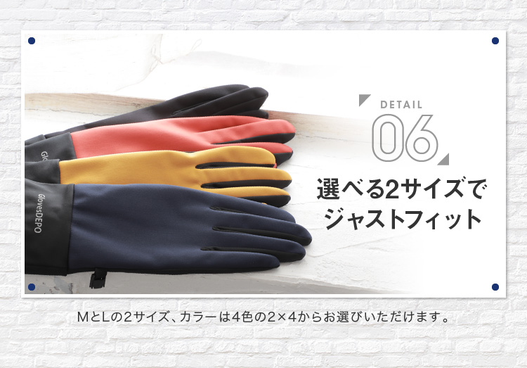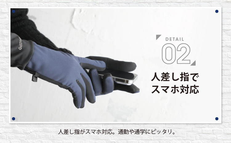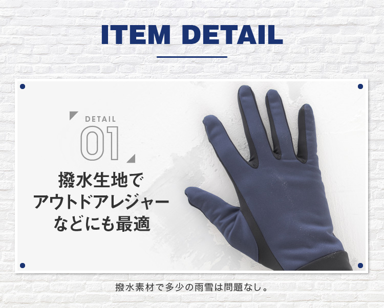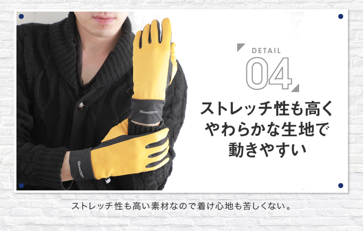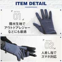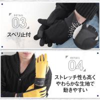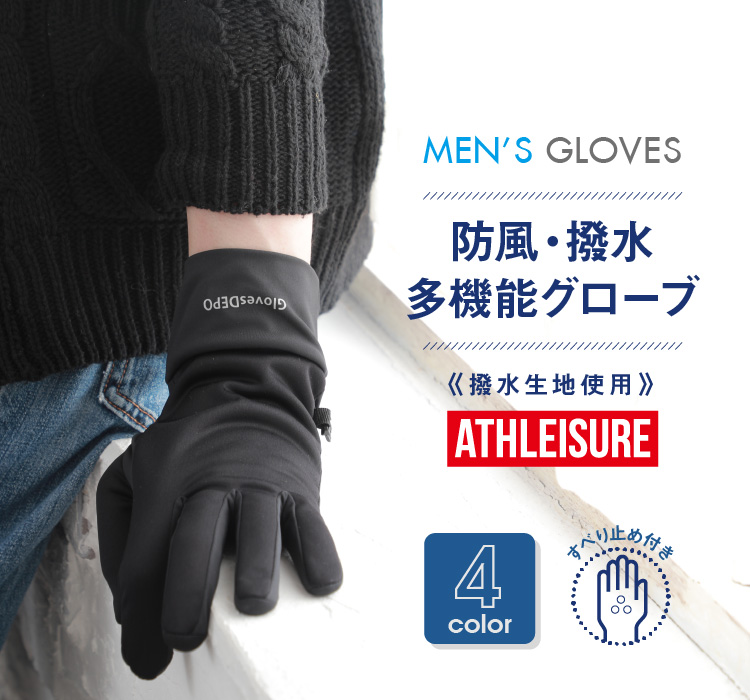 | レジャーにもおすすめ。多機能メンズグローブ | | しなやかで柔らかい風合いで着用してても動きやすい多機能グローブ。スベリ止付かつ防風・撥水でタウンユースだけでなくアウトドアレジャーなどアクティブな方にもおすすめ。ジャージ手袋の様に着用感もスマートなので通勤や通学にもピッタリ。裏地もフリースなのでとってもあったか。ストレッチ性も高い素材なので着け心地も苦しくない。MとLの2サイズ、カラーは4色の2×4からお選びいただけます。 |