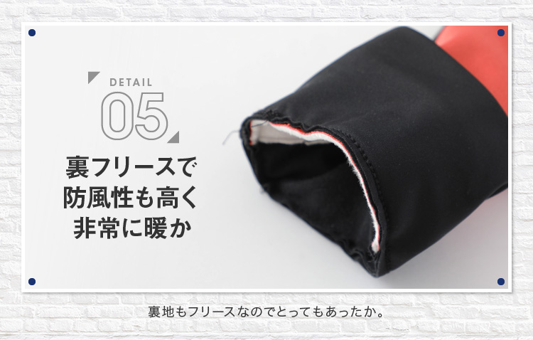 | 素材 | 甲部:ポリエステル 掌部:ポリエステル、ポリウレタン スベリ止部:合成皮革 指先切替部:合成皮革 甲部裏当て布部:ポリエステル |