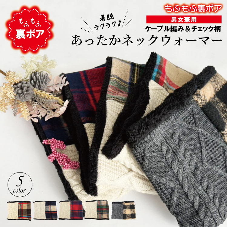 | 着脱ラクラク♪モフモフボアのあったかネックウォーマー | | 表はデザイン的にも秋冬らしいケーブル編みとチェック♪裏はフワフワのボアだから、抜群の温かさと付け心地♪通学や通勤はもちろん、お家でのくつろぎタイムでも重宝するあったかネックウォーマーです♪カラーはブラック、オフホワイト、レッド、グリーンの4種類からお選びいただけます♪ |