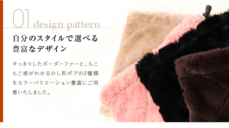 シンプルながらもデザインはボーダーファーと菱形ファーの2種類からお選びいただけます。