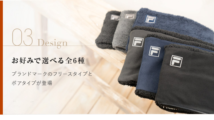 | モフモフふわふわが気持ちいいFILAのネックウォーマー。シンプルにロゴ入りデザインが主張せずに合わせやすい。表地がフリースタイプとボアタイプの2パターンにそれぞれ3色の合計6パターンをご用意。 |