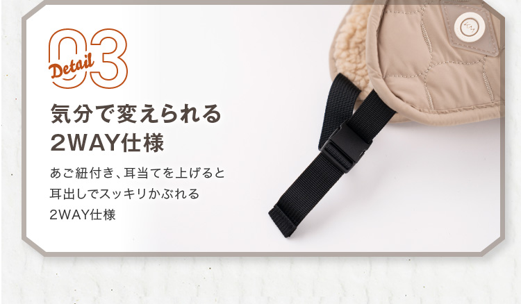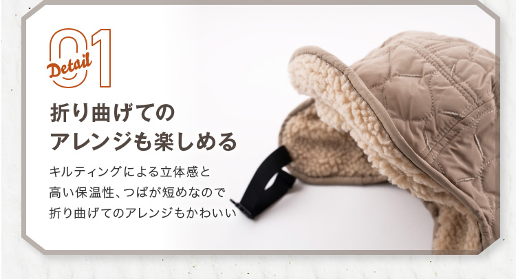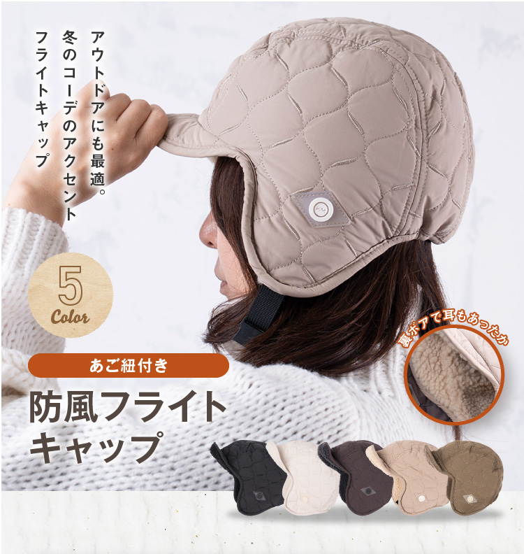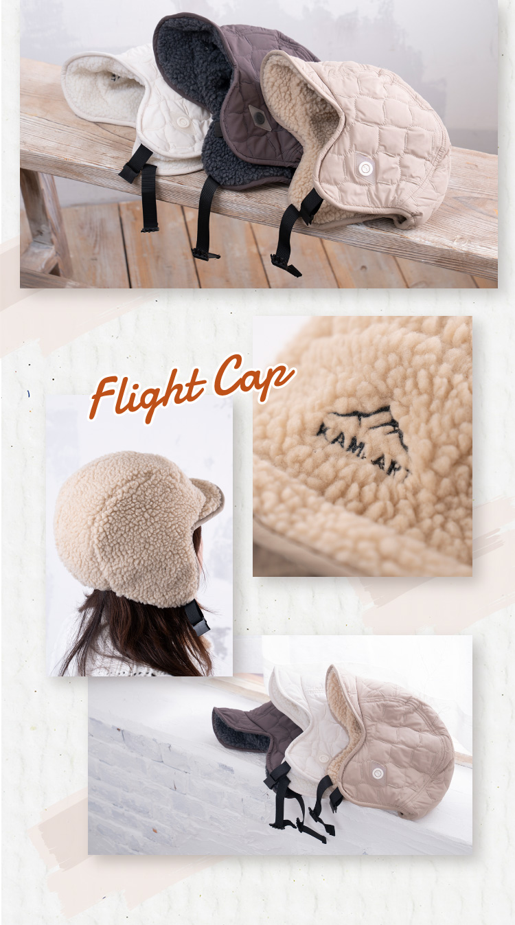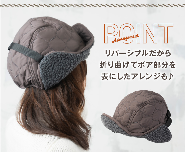 | あご紐付き防風フライトキャップ | | 冬のコーデのアクセントイヤーフラップ付きフライトキャップです。ナイロンのキルティングで見た目はすっきりなのにシンプル過ぎないデザイン。リバーシブルにもなっているのでボア部分を表にすることも可能です。釣りなどのアウトドアにも最適。耳をやさしく守ります。耳当てを下ろしたり、耳当てを上げたりつばを上げたりといろいろなアレンジが可能。 |