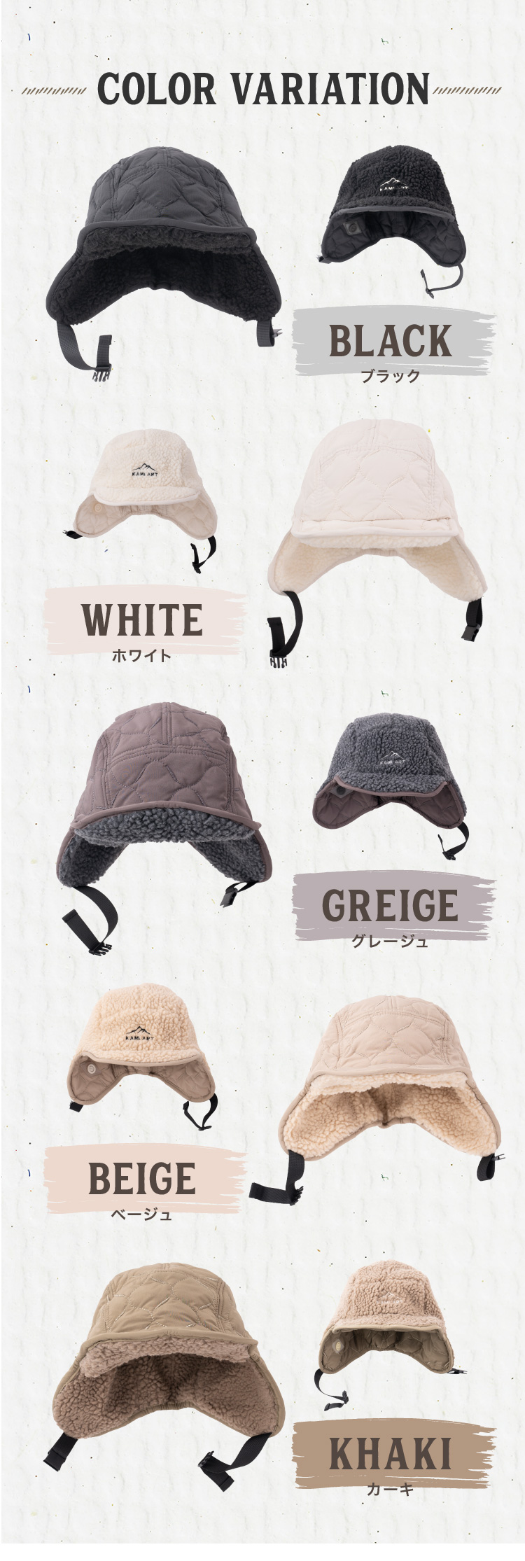 | 素材本体 | 本体:ポリエステル100%、裏ボア部:綿50%、ポリエステル50% あご紐部:ポリエステル、ネーム部:PVC |
