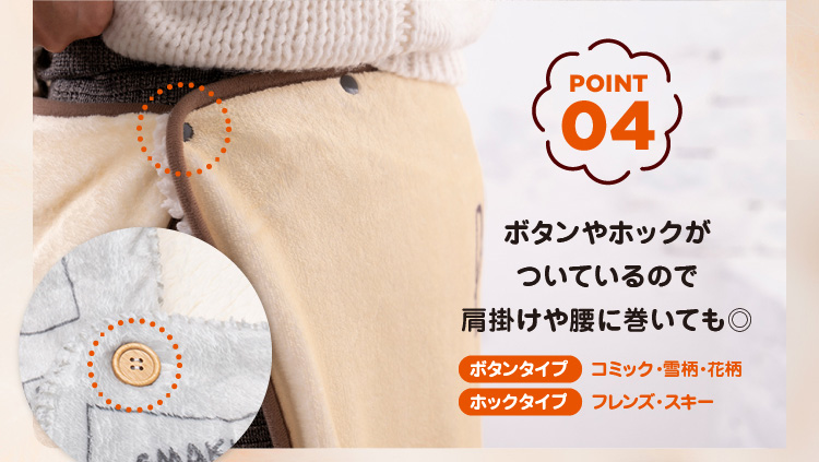 ボタンとボタンホールが付いているので上半身も肩掛け代わりにしてつかったり、こしに巻いて使ったりといろいろな使い方が可能。