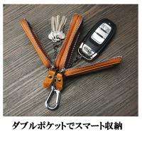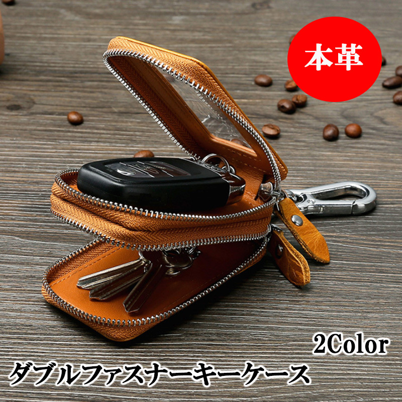 スマートキー 2個収納 ケース 本革 キーレス おしゃれ キーケース 2個 ダブル 牛革 革 レザー ダブルファスナー ファスナー カラビナ キーリング 付き