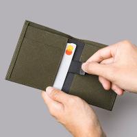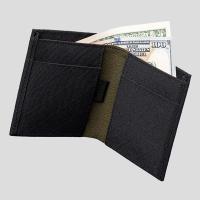 Axogrid生地を使用したコンパクト二つ折り財布。開閉部分にはマグネットが入っており、開いてしまいがちな財布も閉じたまま収納可能です。内側はバイカラー仕様で2色の生地を使い、札入れはオレンジ色の裏地を使用しデザインにもこだわっています。4つのカード入れ、1つの札入れ付きでお札とカードをすっきり持ちたい方に最適な財布です。内側のカードポケットの一つは引き出しタイプになっており、紐を引っ張り、カードが取り出しやすい仕様になっています。グリッド補強されたAxogrid生地を使用し、耐久性と撥水性を備えた丈夫な生地を使用し多少の汚れや水をはじきます。
