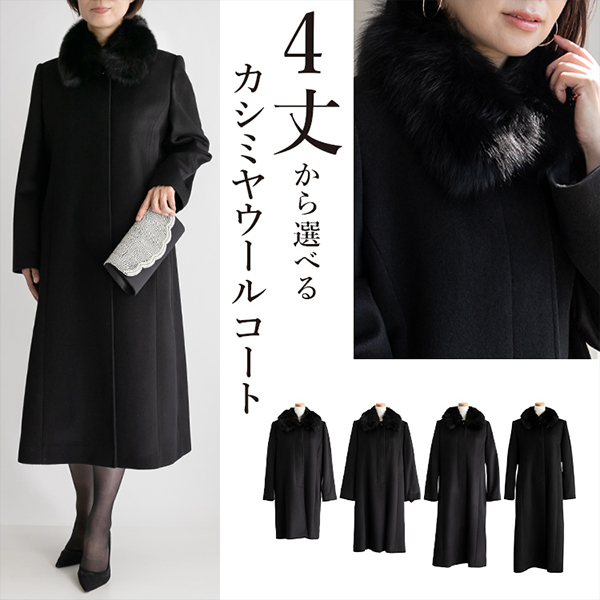 カシミヤウール フォーマルコートは、冠婚葬祭に1着は持っていたいカシミヤを使ったフォーマルにも対応するベーシックで上品なコート。 リッチを楽しむお出かけ着時には衿のファーを付けて、ブラックカラーを喪でお使いいただく際はファーを取り外してブラックフォーマルのコートとしてお使いいただけます。 かしこまったシーンに最適なきちんときれいに着られる防寒にも対応したフォーマルコートが1着あると、とっても重宝しますのでオススメです。 素材は上質なカシミヤ混を使用し、少し毛足を持たせたビーバー仕上げになっているので、軽い着心地と程よい光沢感が一層リッチに見せてくれます。デザインは、プリンセスラインで美しいシルエットに、ショール衿のベーシックなロング丈のきれいめコートで、衿にはブルーフォックスファーが付いており「華やかな静」を感じるデザインとなっております。 袖は、2枚袖のセットインスリーブでスタンダードなコート仕様です。 ポケットは脇切替を利用した大きめのスラッシュポケット、とっさに取り出さないといけないシチュエーションでもさっと手が入ります。 前開きは本比翼でスッキリ仕立てになっておりますので見た目も美しく見えます。