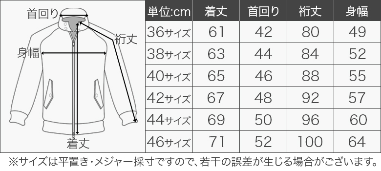 46サイズ(着丈71cm、首回り52cm、裄丈100cm、身幅64cm)
