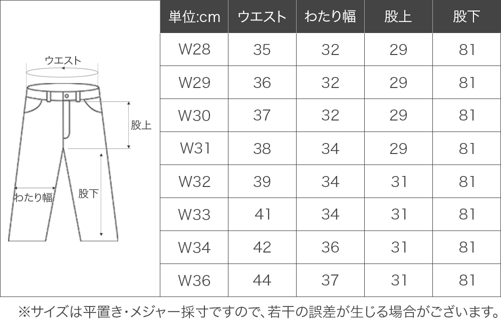 [サイズ]28インチ(ウエスト:約35cm、ワタリ幅:約32cm、股上:約29cm、股下:約81cm)