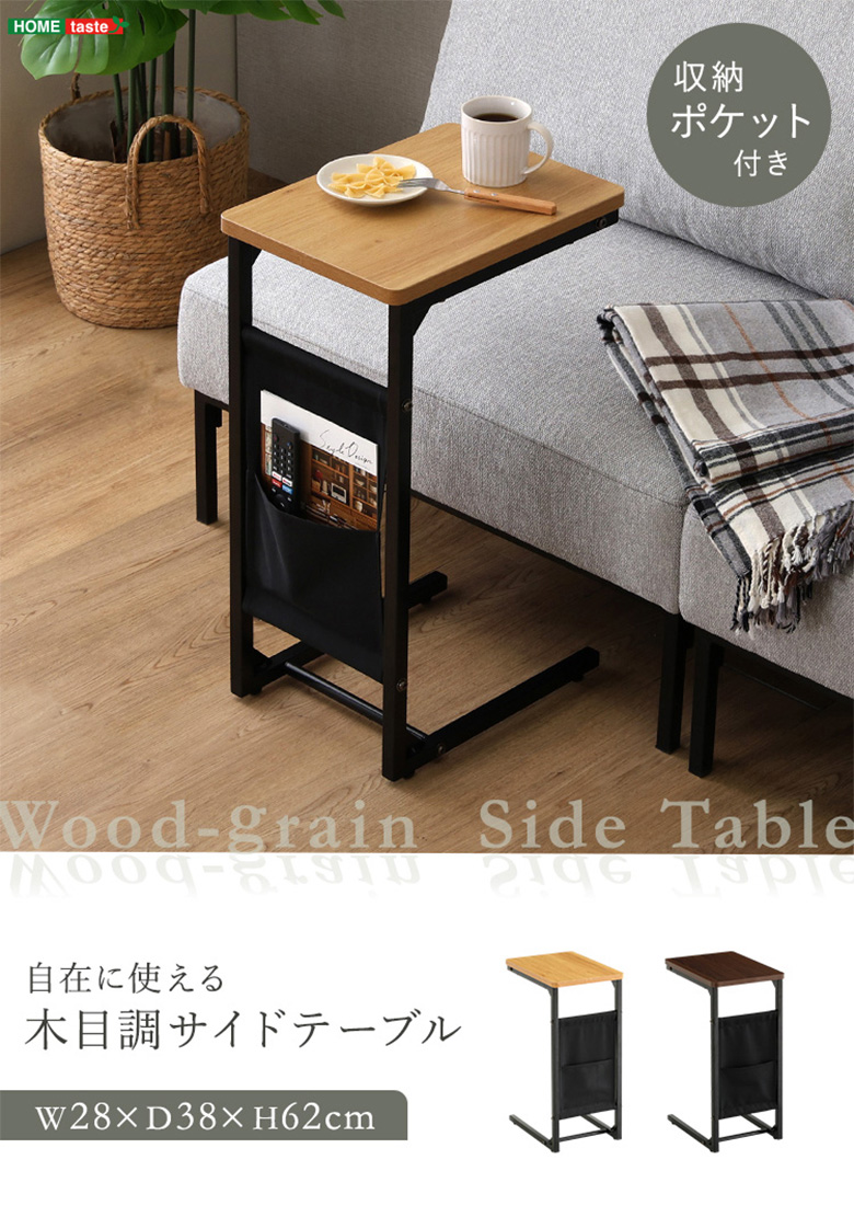 お部屋の様々な場所で活躍する、木目調サイドテーブルです。コの字型なので、ソファに差し込むことによって、簡易的なコーヒーテーブルや作業スペースにできます!ベッドやソファのサイドテーブルとして活躍します!収納ポケットつきで、本や小物をサッとしまうことができます!木目調の天板が雰囲気を演出します!軽量なので、持ち運びしやすく模様替えも楽々!アジャスタ付きなので、床傷の心配もありません!