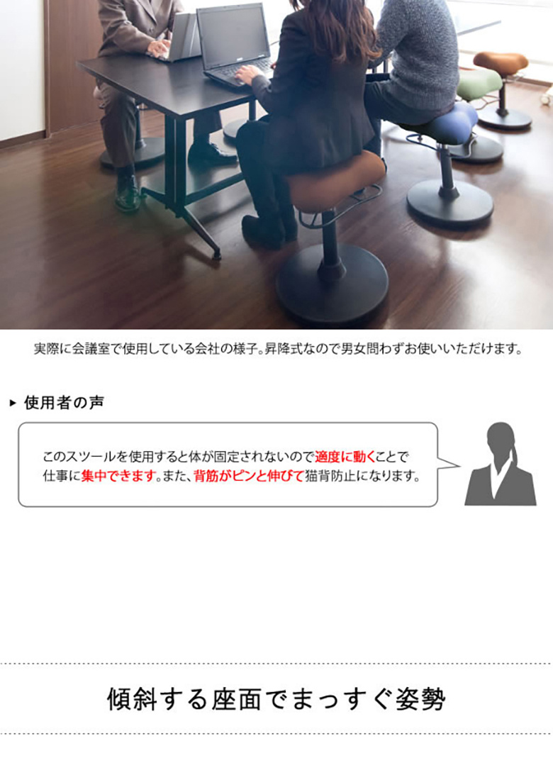 また、傾斜により骨盤がまっすぐになることで背筋が伸び姿勢を矯正。デスクワークやミーティングなどに最適です。