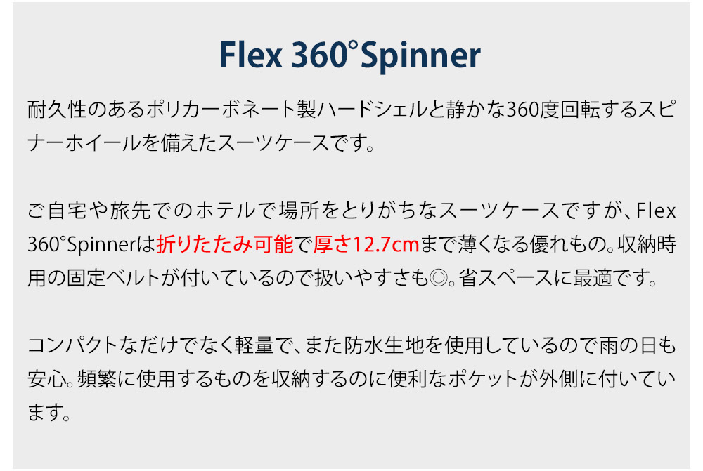 ご自宅や旅先でのホテルで場所をとりがちなスーツケースですが、Flex 360° Spinnerは折りたたみ可能で厚さ12.7cmまで薄くなる優れもの。収納時用の固定ベルトが付いているので扱いやすさも◎。省スペースに最適です。