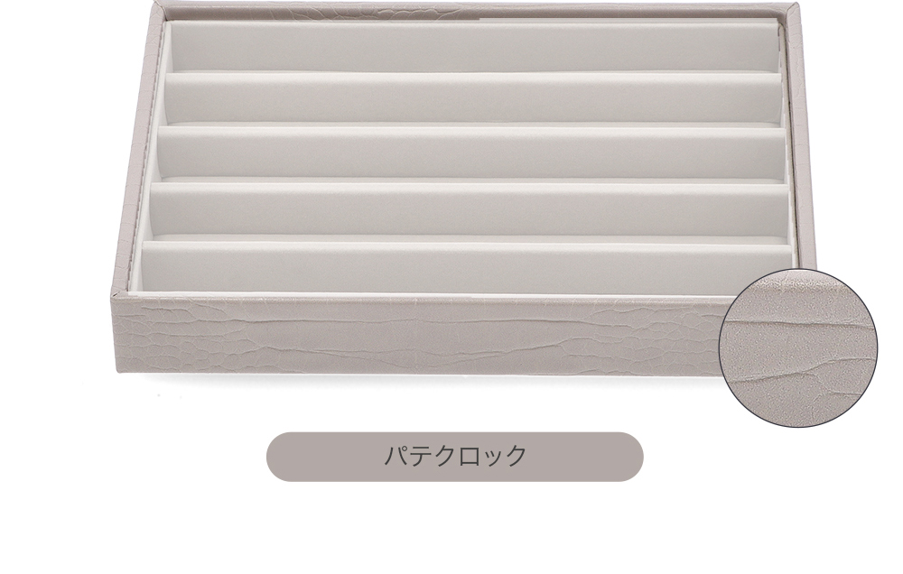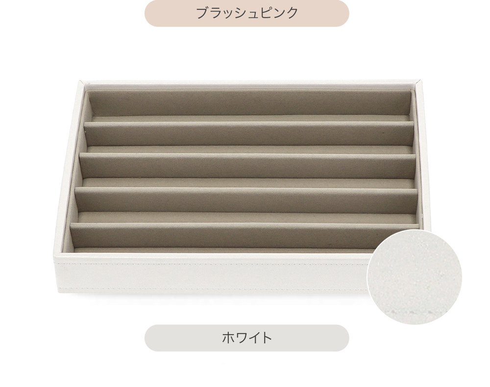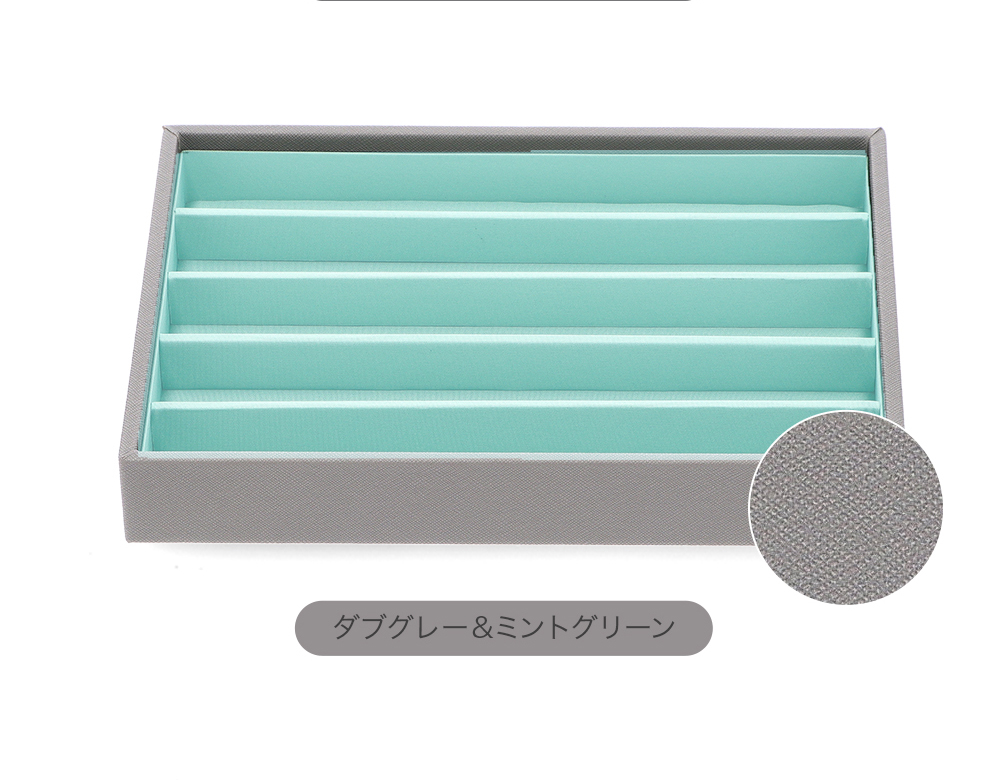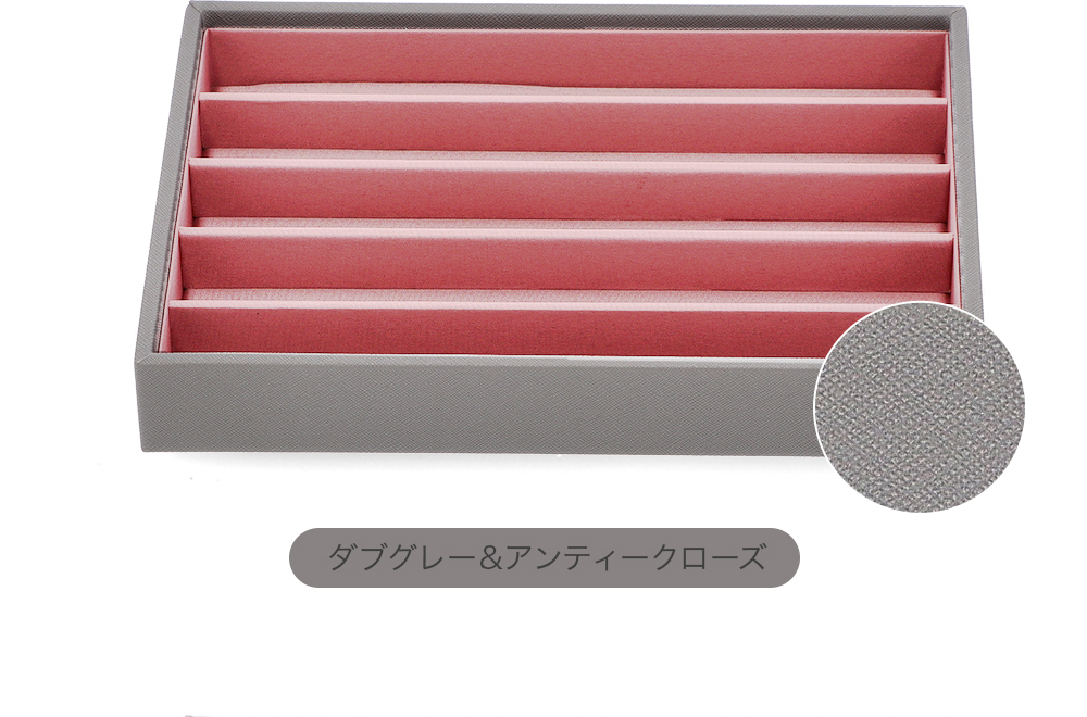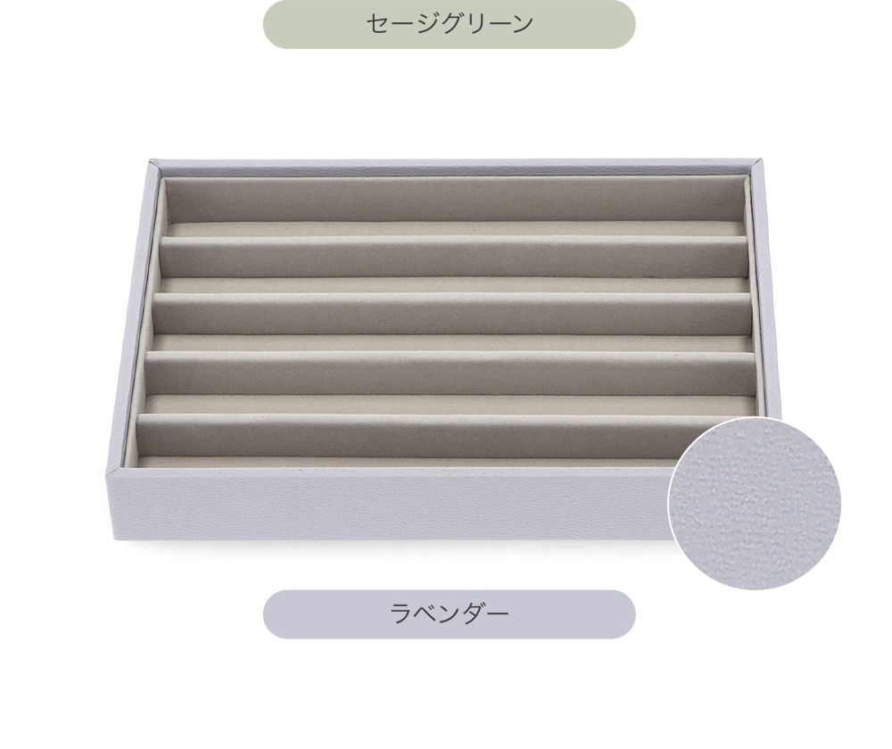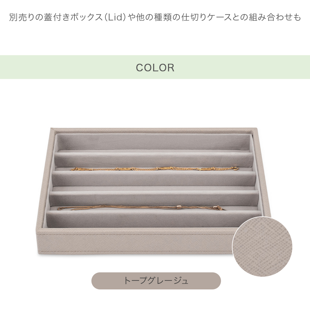 こちら単品で、ジュエリートレーとしてや引き出し内でお使いいただいても良いですし、別売りの蓋付きボックス(Lid)や他の種類の仕切りケースと組み合わせて、ジュエリーボックスとしてもお使いいただけます。