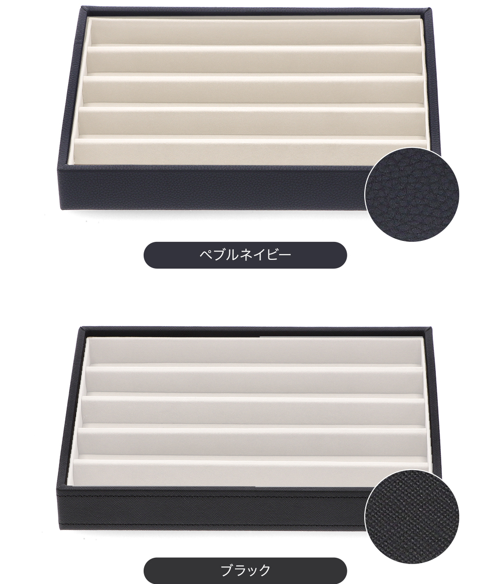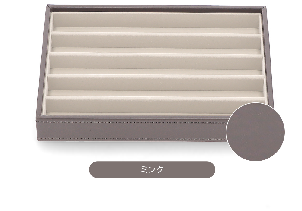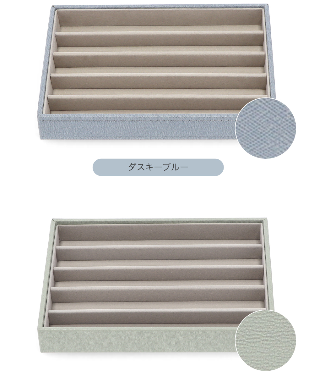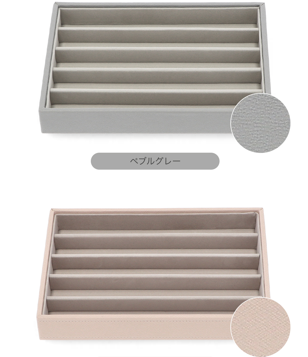 こちら単品で、ジュエリートレーとしてや引き出し内でお使いいただいても良いですし、別売りの蓋付きボックス(Lid)や他の種類の仕切りケースと組み合わせて、ジュエリーボックスとしてもお使いいただけます。