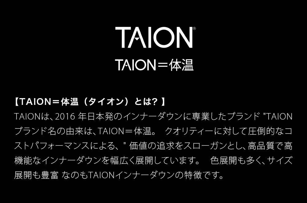 「TAION」のブランド名の由来は、TAION=体温。 “クオリティーに対しての圧倒的コストパフォーマンスによる価値の追求”をスローガンとし、高品質で高機能なインナーダウンを幅広く展開しています。 色やサイズの豊富なバリエーションもTAIONの特徴です。