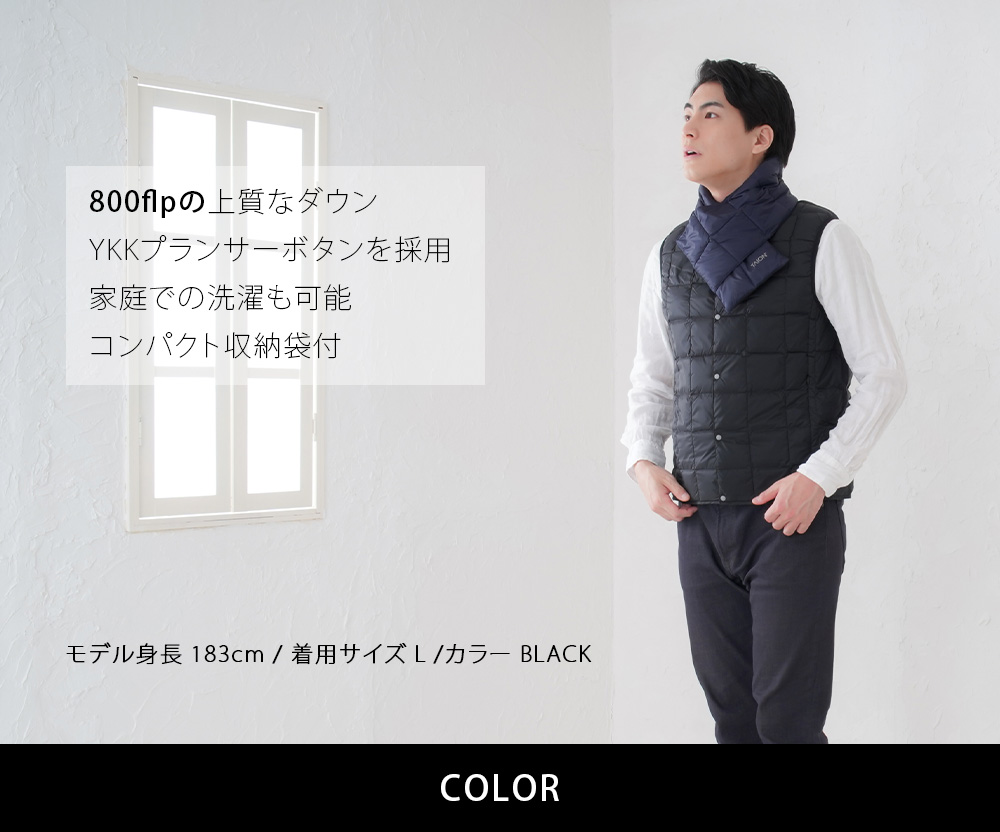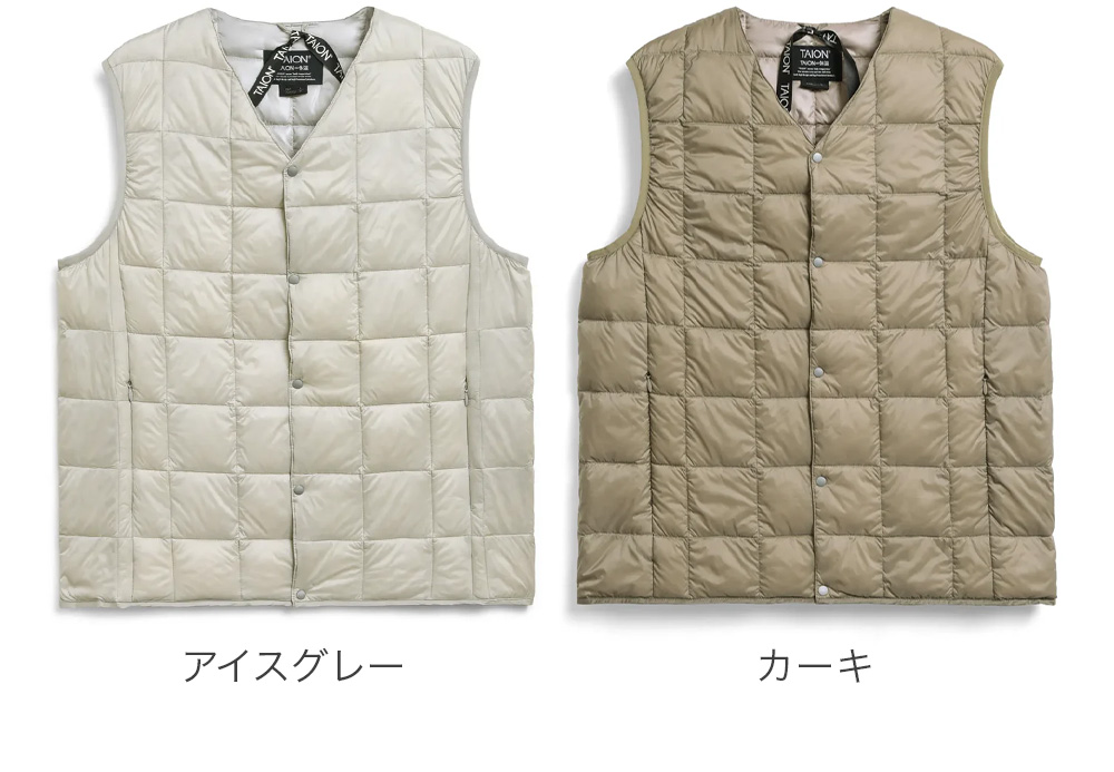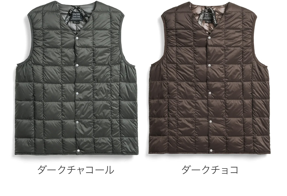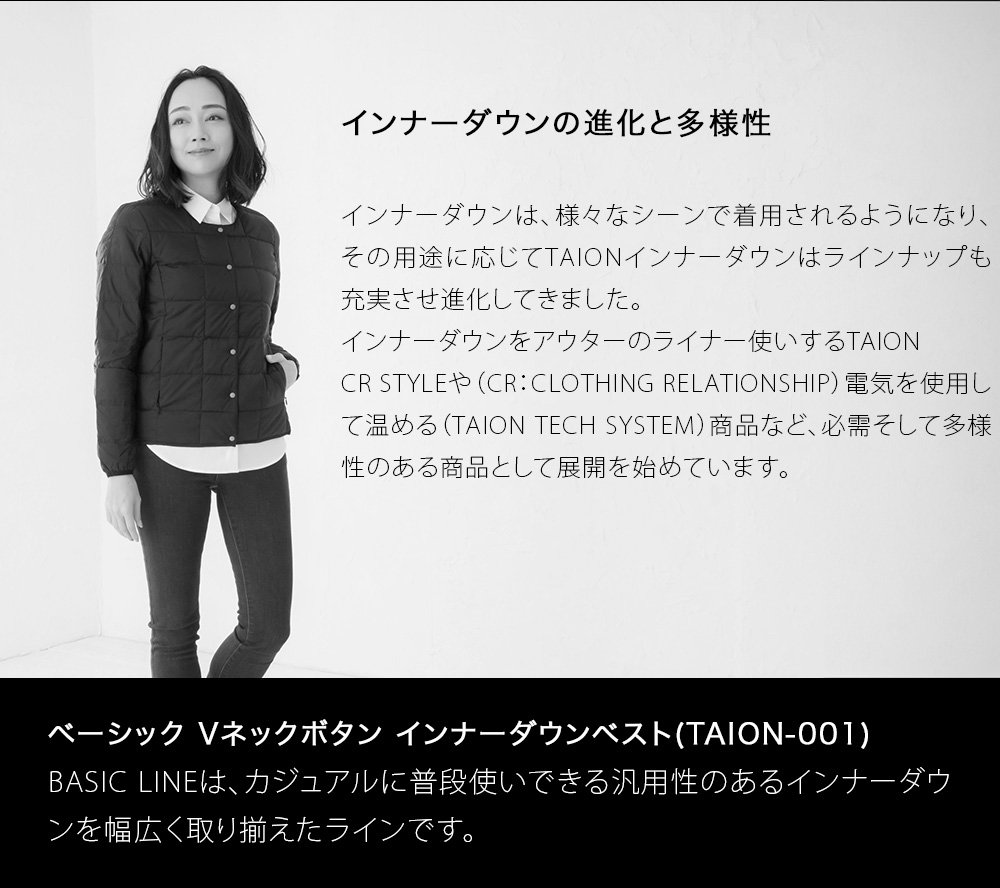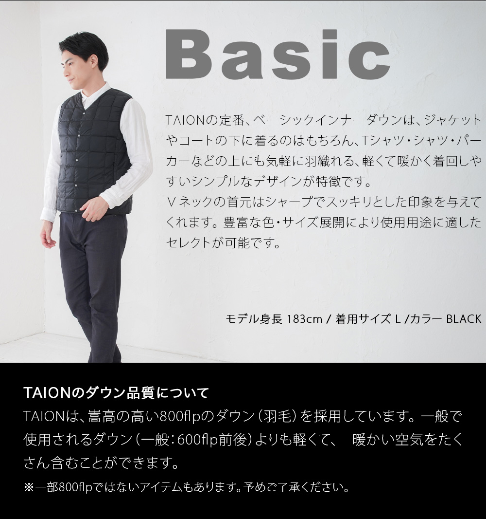 TAIONの定番、ベーシックインナーダウンは、ジャケットやコートの下に着るのはもちろん、Tシャツ・シャツ・パーカーなどの上にも気軽に羽織れる、軽くて暖かく着回しやすいシンプルなデザインが特徴です。