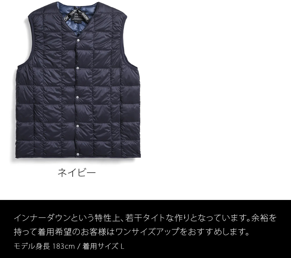 ※インナーダウンという特性上、若干タイトな作りとなっています。余裕を持って着用希望のお客様はワンサイズアップをおすすめします。