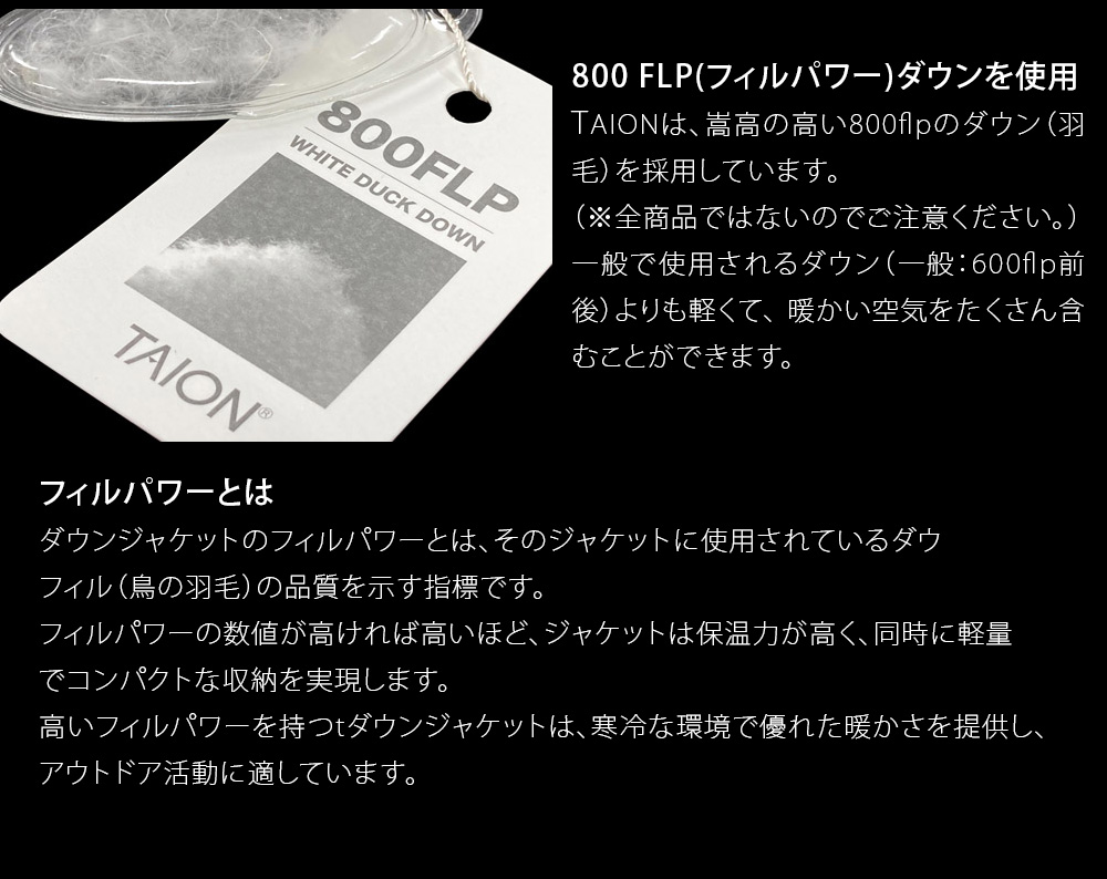 ・800FLPの上質なダウンを使用しています。 一般で使用されるダウン(一般:600flp前後)よりも軽くて、 暖かい空気をたくさん含むことができます。
