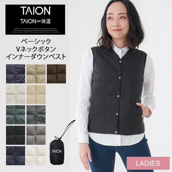 正規販売店 タイオン ダウンベスト インナーダウン ダウンジャケット ライトダウン アウター 防寒 温かい 軽量 おしゃれ アウトドア 上着 羽織り Vネック 前開き 保温