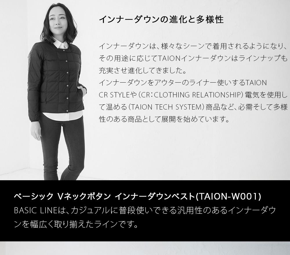"TAIONの定番、ベーシックインナーダウンは、ジャケットやコートの下に着るのはもちろん、Tシャツ・シャツ・パーカーなどの上にも気軽に羽織れる、軽くて暖かく着回しやすいシンプルなデザインが特徴です。Vネックの首元はシャープでスッキリとした印象を与えてくれます。