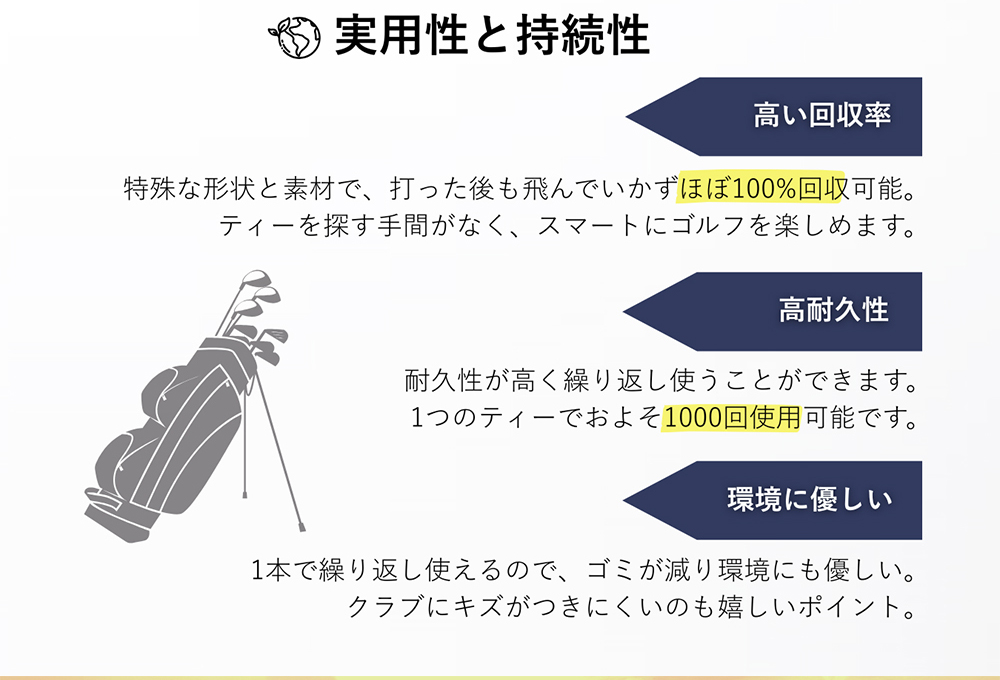 従来のティーにはない高い耐久性とパフォーマンスが特徴で、プロからアマチュアまで幅広く愛用されています。