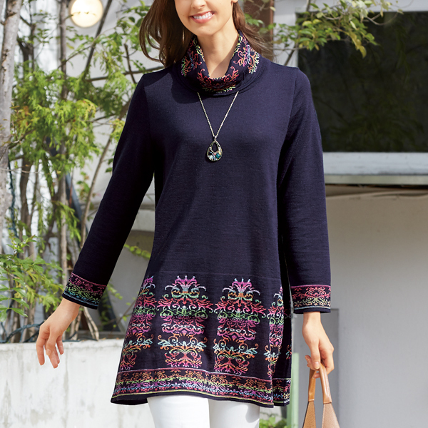 発色よく気品あふれる濃紺(ブルーフォンセ)に染め上げたベビーアルパカ。本作品はその毛糸を用い、ニットを知りつくした新潟県「五泉ニット」の熟練職人が丹念な手作業でジャカード編み。10色の絣糸を巧みに交差させて描いたヨーロッパ伝統のルネサンス文様が、虹色の華やぎも見事に裾やオフタートル、袖口にあしらわれました。身に纏えば、絣糸を美しく編み上げた豊かな感性と高級感に酔いしれて…。リビングで、お友達とのカフェで、美しい貴女を印象づけることでしょう。