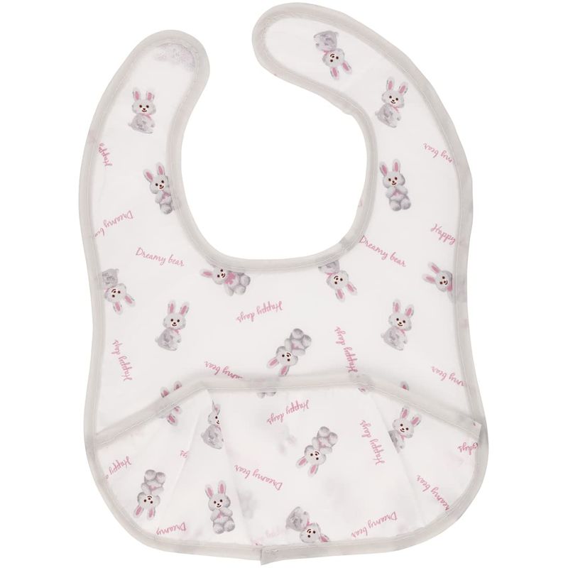 うさぎのぬいぐるみ柄が可愛い♪薄くて軽い!携帯に便利なベビーエプロン2枚組。撥水加工で汚れにくく、洗濯機で洗えるからお手入れも簡単!食べこぼしキャッチの立体ポケット付き